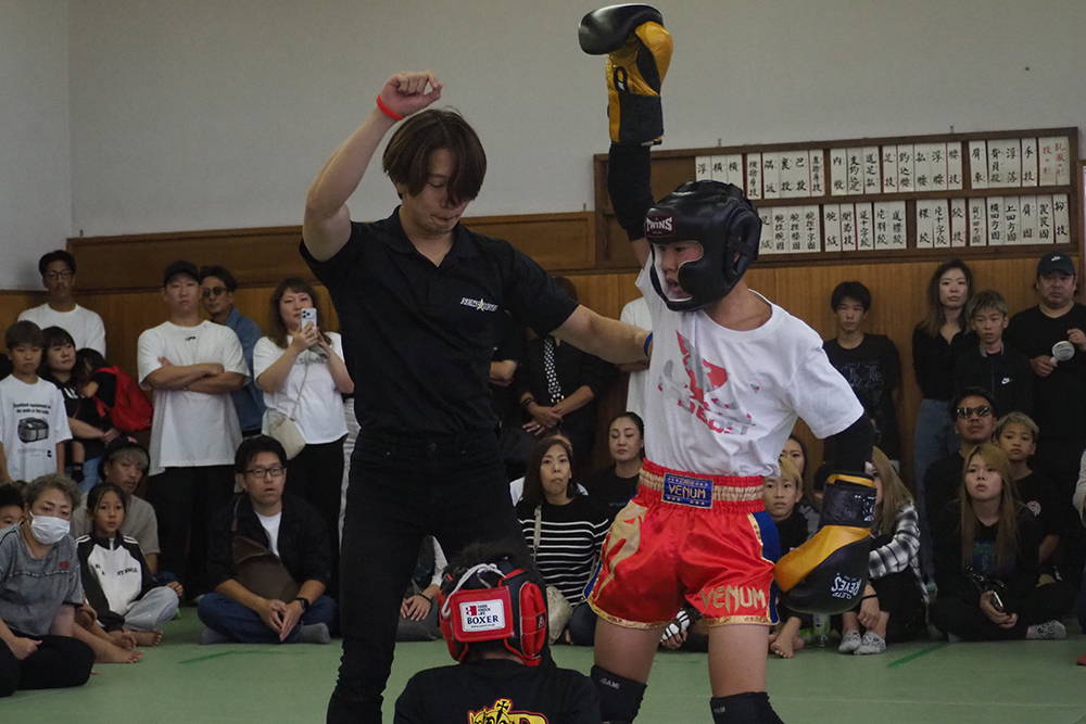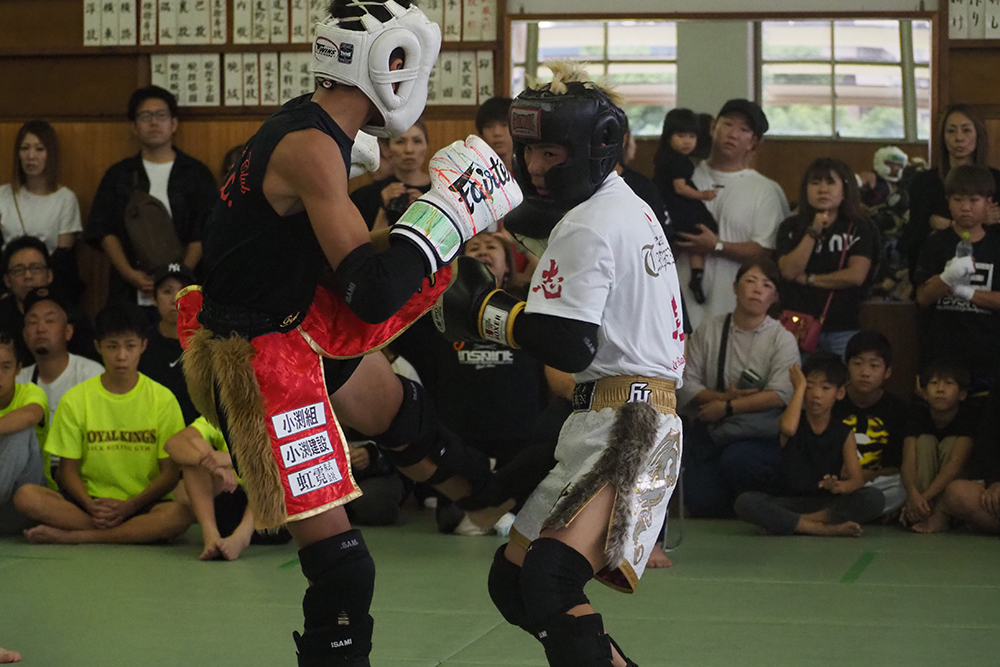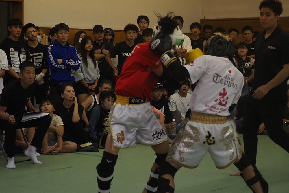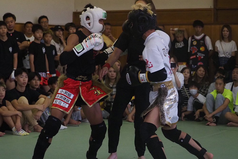 また40kg以下ではその柚山の兄である柚山望大 ( 魁塾 )と河田琉珀 ( ROYAL KINGS )が激突すると開始早々から柚山は圧巻のパンチラッシュに左ハイキックとヒットさせ早速印象を掴む。そこに河田もひるむことなくワンツーで踏み込みチャンスを狙うもラウンドを通じて柚山の攻勢が目立っていく印象。続く2Rには前に出続ける河田から柚山はストレートでダウン奪取。再開後は勢いのままにラッシュ、左ハイも再びヒットさせるなど決めに向かうも河田は止まらない。最後までチャンスを狙い前に出続ける河田の姿勢は素晴らしい、しかしそれを柚山は完全にシャットアウト。判定は3-0、柚山が圧巻の攻勢で判定勝利を勝ち取った。すると45kg以下ではその柚山の更に兄、柚山祗大 ( 魁塾 中川道場 )が永野凱理 ( 02GYM )と対戦。すると柚山はリーチを存分に生かし開始早々から怒涛のワンツーに膝のラッシュで永野を貼り付けにしていく。永野も流れを変えたい所だったが柚山はそれを許さず猛攻を続けていきそのままレフェリーストップとなり柚山が1RTKO勝利。柚山兄弟の3人それぞれが自身の強みを見せつけ兄弟全員で勝利を勝ち取った。
