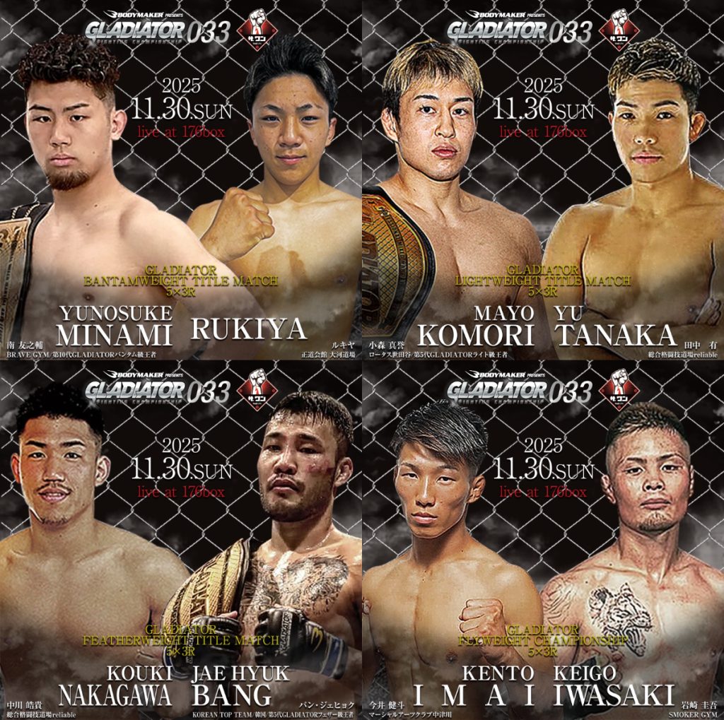 2025年11月30日BODYMAKERpresents GLADIATOR 033 in OSAKAスケジュールをご覧ください。