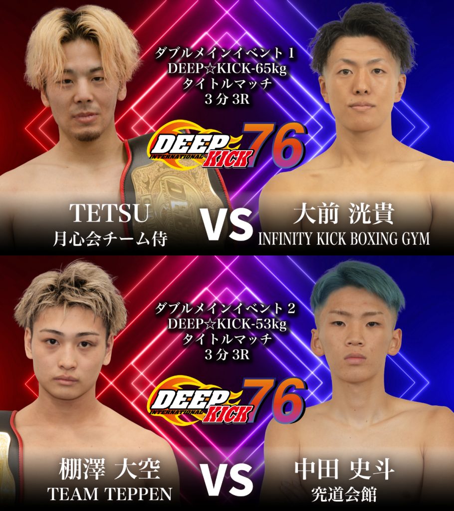 まずはDEEP☆KICK-53kg、3月にDEEP☆KICK-53kg第7代王者に輝いた棚澤大空(TEAM TEPPEN)の初防衛戦に挑戦者決定トーナメントを勝ち上がってきた中田史斗(究道会館)が挑む。両者は今年2月、前王座決定トーナメント準決勝で対戦経験があり、その際は棚澤が判定勝利を収めそのまま3月に王座戴冠を果たしている。