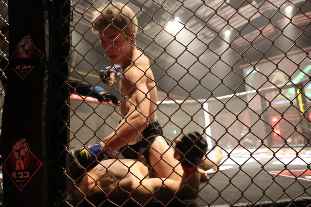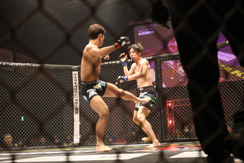 開始はスタンドの打撃でパンチ、カーフを見せるが、小森が組んでからグラウンドへ持ち込む。バックを取る小森だが、田中も立ち上がり、小森はシングルバックで喰らい付き、スタンドバックをキープして小森が有利な1ラウンド。2ラウンド、打撃となるが、田中のハイミドルを小森はキャッチしてからグラウンドへ移行させ、ポジションを取り行く小森だが、田中もスタンドへ戻し、正対で組むが小森は細かい膝蹴りを入れる。田中もシグナルレッグからテイクダウンを取りバックを狙うが、小森もスタンドへ戻してから正対する。膝蹴りを見せ、ラストはパンチで打ち合ってから2ラウンド終了。最終ラウンド、田中がパンチで攻め、タックルで組みを仕掛け、ケージ際の攻防となるが、小森が田中をケージに押し込んでから膝蹴りを入れ、スタンド展開になり小森のパンチが入り、田中がダウン。一気にグラウンドへ攻める小森だが、田中もバックを奪うと小森はスタンドへ戻し正対させ、田中もケージに押し込んでからグラウンドでサイドを取るが、小森もスクランブルで立ち上がるなど、一進一退の攻防となる。判定は小森が勝利する。