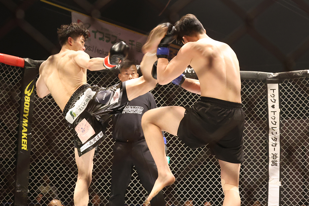 開始はジャブを出し、松本はローも見せる。打ち合いから組みとなり、土井はケージに押し込むが、松本は膝を入れ、土井も離れる。スタンドは続きパンチの打ち合いから組みに移り、松本は膝を入れるが、ケージ中央での展開に変わるとパンチの打ち合いとなり、ケージ際での攻防となる。ラストはパンチで打ち合い、松本はカーフを入れ、土井も組んでからの膝蹴りを入れる。最終ラウンド、パンチの打ち合いを繰り広げ、土井は首相撲からの膝を単発で入れるが、松本のパンチが手数で多く、土井をケージに詰めてからパンチをラッシュで浴びせ、組んでからテイクダウンを奪い、上からパウンドを入れ、バックも奪ってからパウンドを入れる。土井も何とかスタンドに戻りたいが、松本はパウンドを浴びせ続け、レフェリーが試合をストップ。TKOで松本が勝利する。