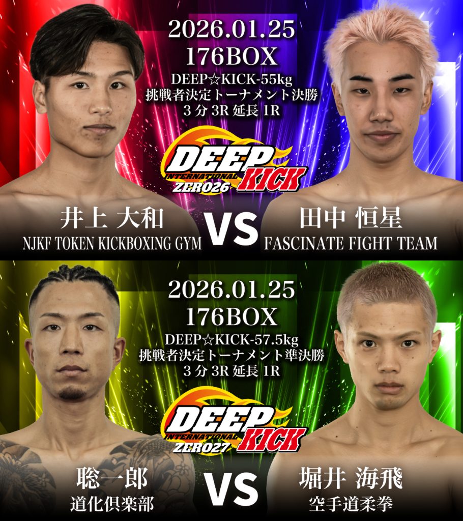 2026年、新年1発目の興行となるは若手選手育成の舞台として開催している「DEEP☆KICK ZERO」大会、来年1月25日(日)豊中市・176BOXにて第1部『DEEP☆KICK ZERO 26』、第2部『DEEP☆KICK ZERO 27』の2部構成での開催が決定。その第1弾対戦カードとして、DEEP☆KICK-55kg挑戦者決定トーナメント決勝に加えDEEP☆KICK-57.5kg挑戦者決定トーナメントの開催が発表された。