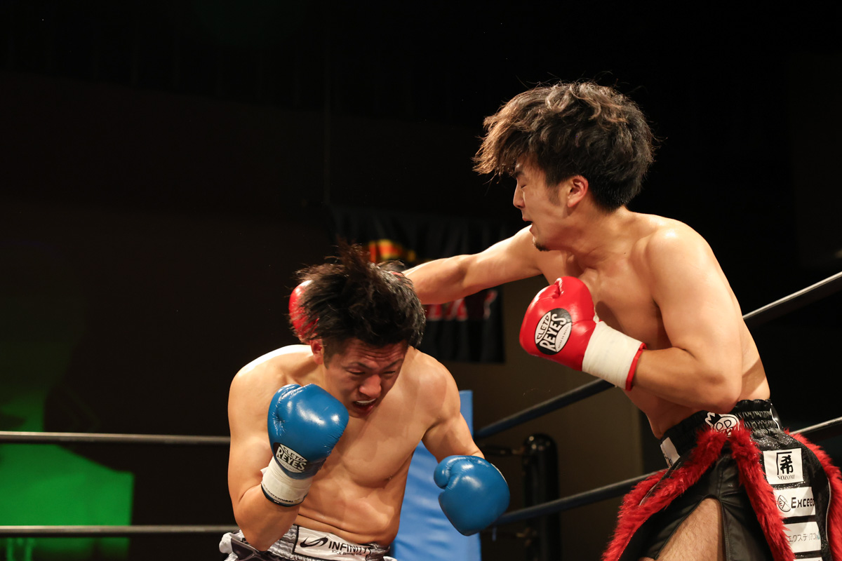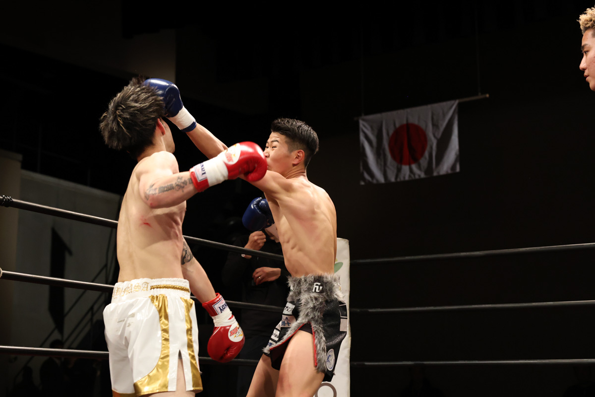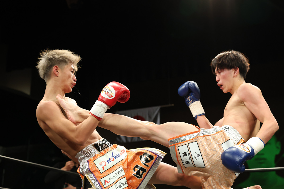 前戦でプロ初勝利を掴みとり今回がプロ4戦目となる同士である根本日向(TEAM LIGHT)と林ジャッカル裕人(心将塾)の1戦。試合は1R、ジャブに左フックと放つ根本に対し林は前蹴りにミドル・ローと蹴り技を中心に繰り出す。根本は近距離でのパンチ回転が速い、林はラウンド終盤にはカーフを効かせ好印象を残す。続く2R、中央に陣取る林は1R同様に蹴り技で圧をかけていく、根本は入ってきたところに1・2・3とパンチ連打を放つもここでも林の蹴りが印象的か。2R終了時点でのオープンスコアは3者共に19-20で林を支持。