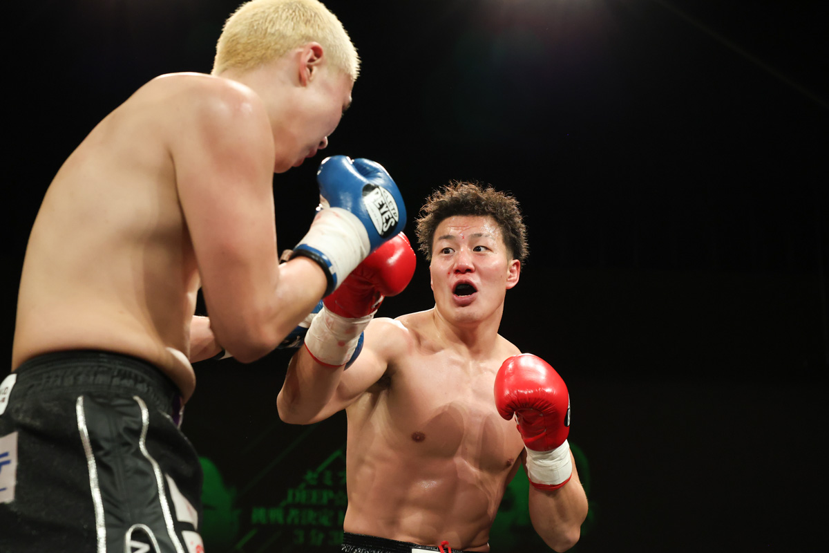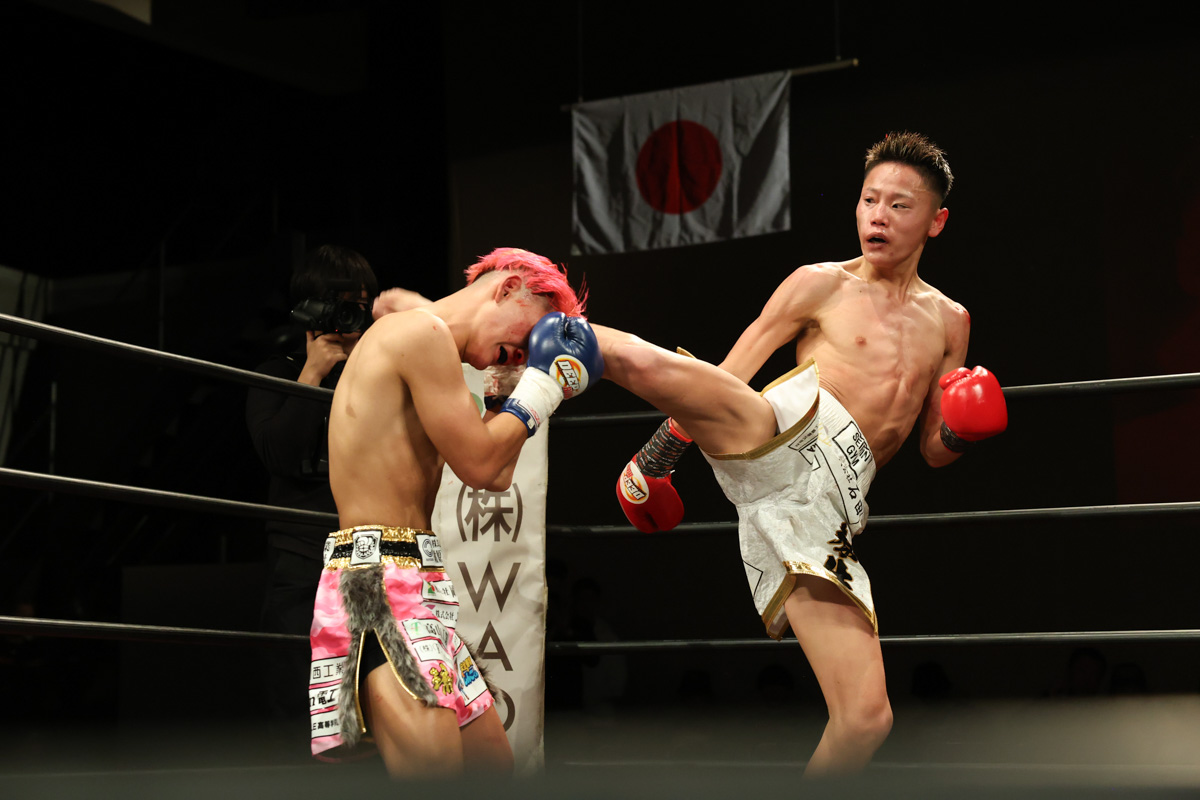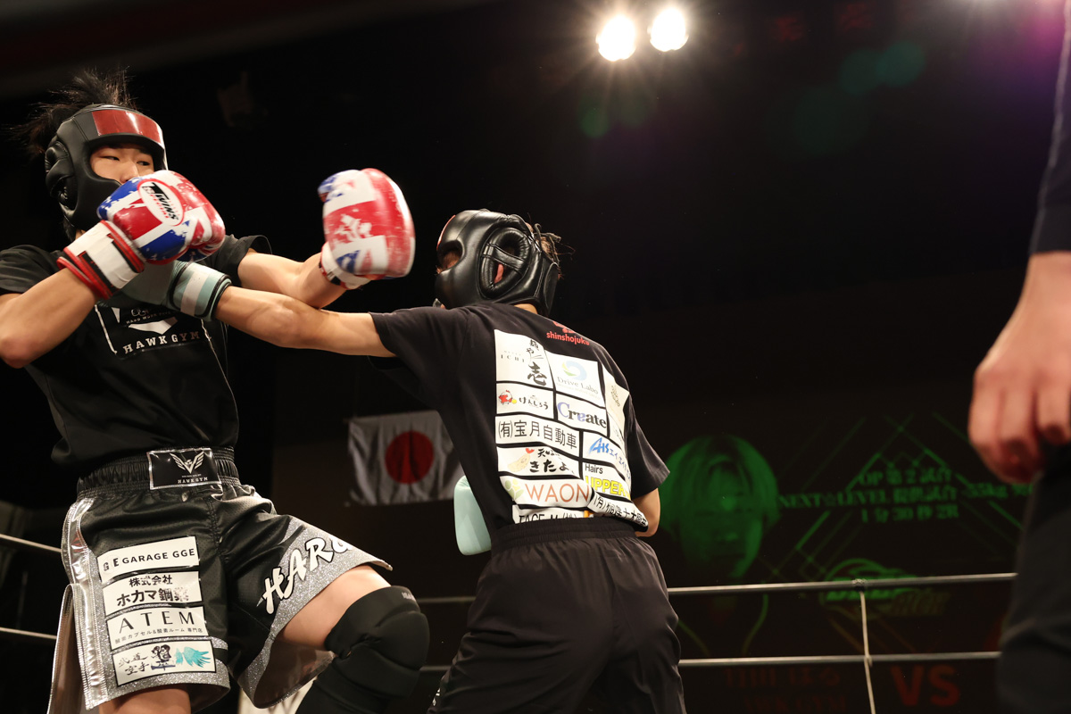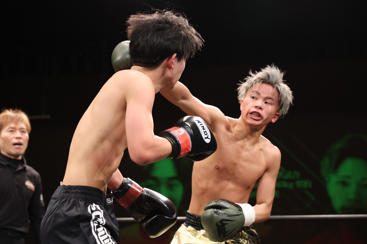 前戦でプロ初勝利を掴みとり今回がプロ4戦目となる同士である根本日向(TEAM LIGHT)と林ジャッカル裕人(心将塾)の1戦。試合は1R、ジャブに左フックと放つ根本に対し林は前蹴りにミドル・ローと蹴り技を中心に繰り出す。根本は近距離でのパンチ回転が速い、林はラウンド終盤にはカーフを効かせ好印象を残す。続く2R、中央に陣取る林は1R同様に蹴り技で圧をかけていく、根本は入ってきたところに1・2・3とパンチ連打を放つもここでも林の蹴りが印象的か。2R終了時点でのオープンスコアは3者共に19-20で林を支持。