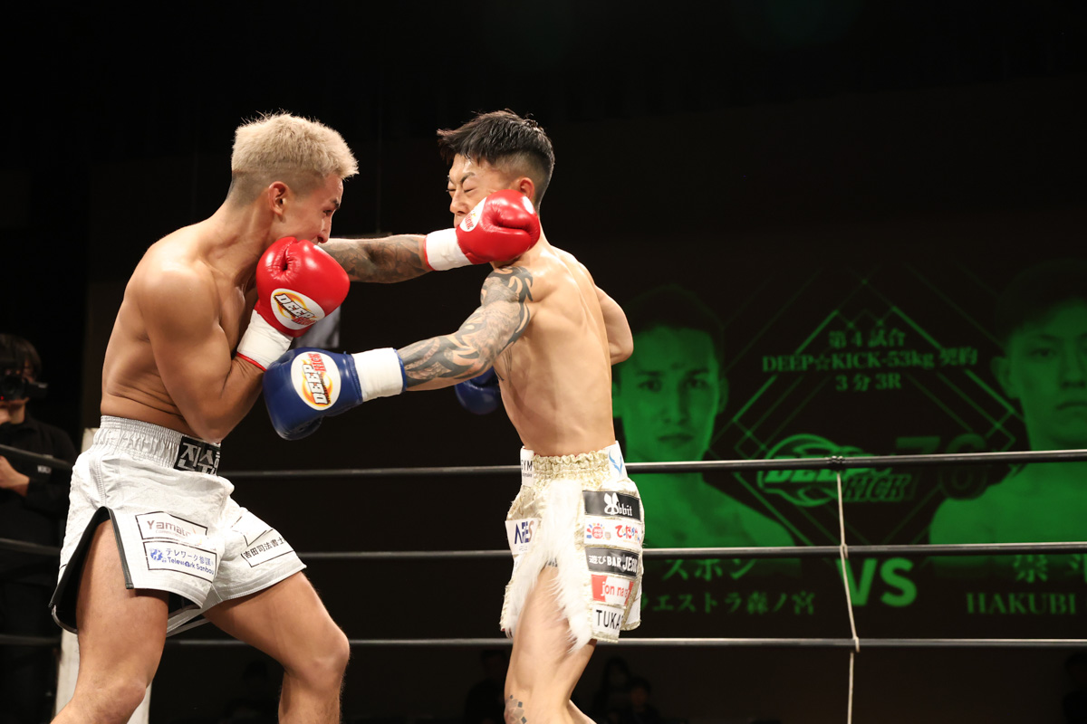 DEEP☆KICK-53kg契約、スホン(パラエストラ森ノ宮)と崇斗(HAKUBI GYM)の1戦。試合は互いにカーフで削り合いながら、スホンは前蹴りにワンツー、崇斗はインローに膝と繰り出すも1Rは互角の印象。続く2R、スホンは圧を強めるもここで光ったのは崇斗の攻勢、パンチをまとめスホンにガードを固めさせたところに膝・カーフ・インローと打ち分ける展開が続いていく。スホンもストレートにフックと返すもこのラウンドは崇斗のラウンドだ、2R終了時点でのオープンスコアはジャッジ3名共に19-20で崇斗を支持する。