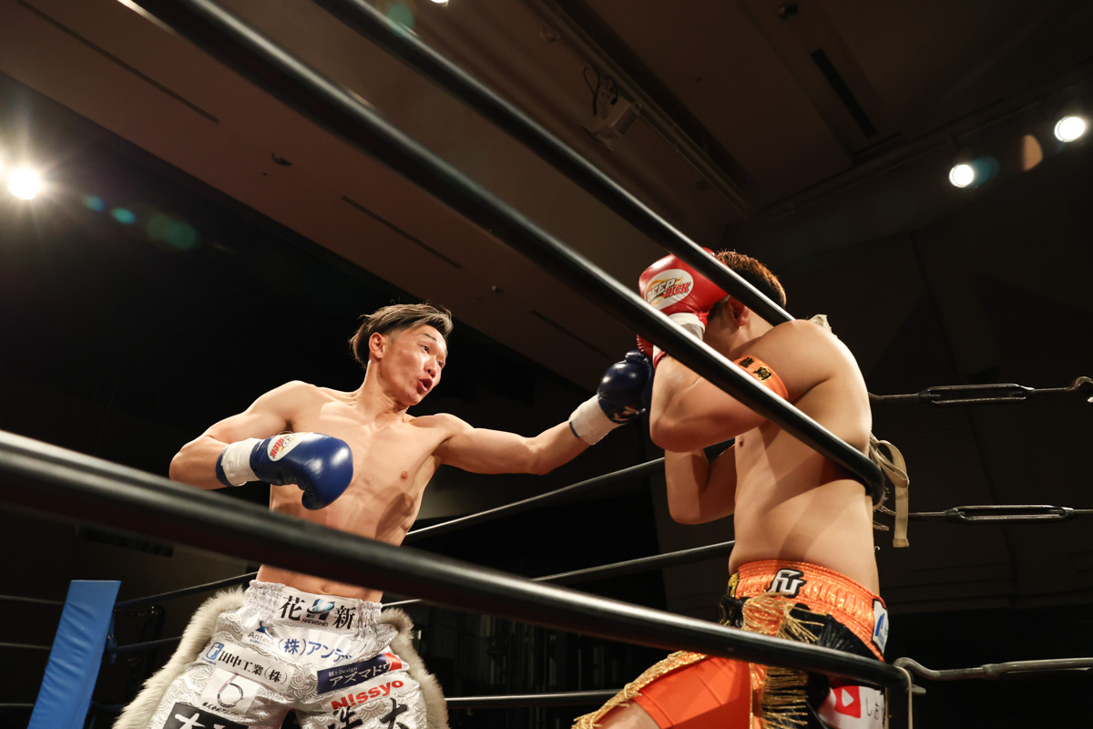 1R、互いにローを軸に探り合うような静かな立ち上がりを迎える中、龍翔の踏み込みに合わせて放たれた花見の威力抜群の右ストレートが龍翔にヒットしそのまま花見がファーストダウンを奪う。明らかな急展開にあっけに取られる会場、すっと立ち上がり落ち着いた表情を見せる龍翔だがダメージはありそうだ。花見はそのまま距離を詰めていくと再びの右ストレートを龍翔にクリーンヒットさせ腰が落ちた所にパンチラッシュで2度目のダウン、ダウンカウントが進む中で龍翔のダメージを見たレフェリーが試合をストップし1R1分28秒。同級上位ランカー相手に2発の右ストレートで2ダウンを奪った花見がTKO勝利を奪った。