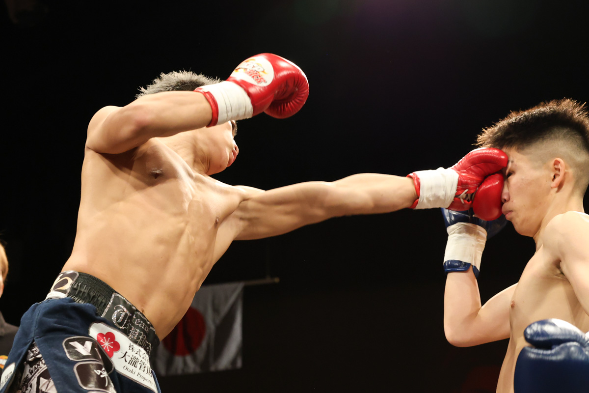 試合は1R、ガードを固めながらフックとボディブローを軸に前に打ち出る小野田に対し泰生はジャブを基軸に真っすぐのパンチにローでヒットを重ねていく。互いに最軽量急なだけあって1つ1つの攻防が速い、続く2Rもジャブにワンツー、ハイに前蹴りと距離を保ちながら放つ泰生に小野田はガードをがっちり固めて前に踏み込み速いコンビネーションを返していく。中で目立つのは泰生のヒットか、2R後半には小野田の鼻から出血が見られるようになる。2R終了時点でのオープンスコアは1名が19-19も2名が20-19、20-18でそれぞれ泰生を支持する。