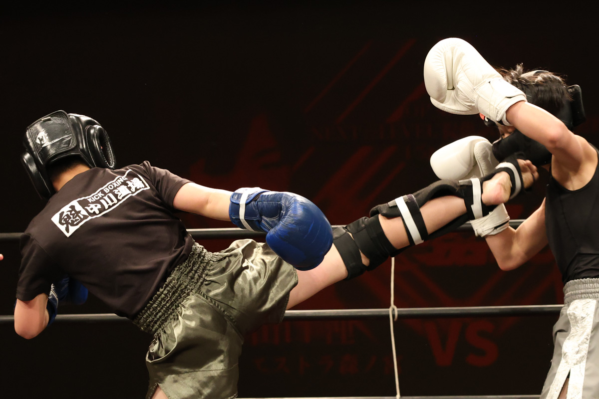 OPイベント、アマチュアファイトでは5試合が開催された。中でもOP第4試合で行われた”50歳越えの中谷”対決である中谷巌(心将塾)と中谷貴巳(HAWK GYM)の1戦はアマチュアファイトながらも会場から大歓声を巻き起こす激戦に。試合はいきなり急展開、1R開始6秒で早くも貴巳が右ストレートでダウンを奪う。ダメージは明らかも巌は折れない、再開後パンチをもらいながらも前に押し出て打ち返していく。すると2Rには巌が左ストレートを効かせパンチラッシュで貴巳を貼り付けに、そのままスタンディングダウンを奪い返したと思った最中、同タイミングで放たれた貴巳の右ストレートが巌を捉えるとプロでも珍しいダブルノックダウンが巻き起こりそのまま試合終了。判定は各ラウンドにダウンを奪った貴巳が判定勝利、「50歳を超えてもまだまだ現役」というのを貴巳・巌ともに体現したような1戦であった。