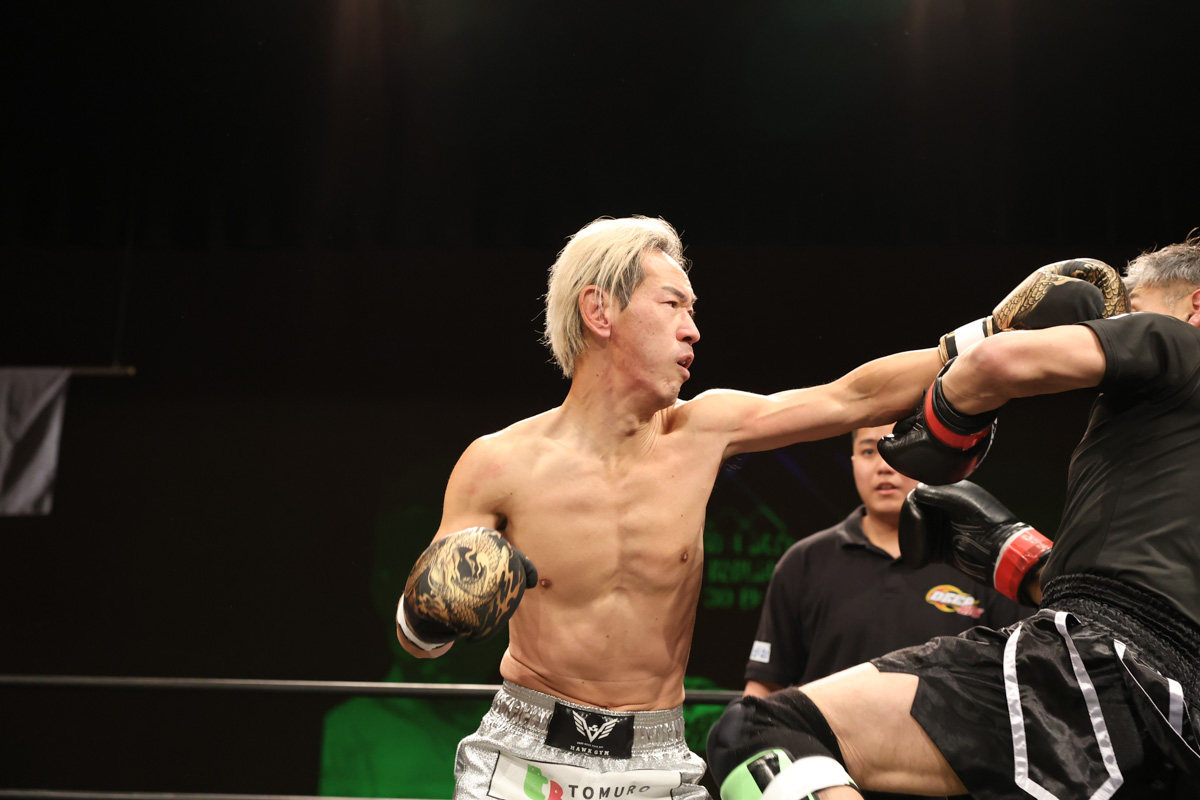 そんな両名の試合は1R早々から急展開を迎える。左前蹴りを蹴りながら入りどころを伺う大前に対しTETSUはジャブにローと鋭い動きを魅せると、パンチで大前が下がったところに追いかけざまの右ハイキックで1R序盤からダウン奪取を果たす。すると大前はここでスイッチオン、激しく圧をかけながら前に前にと踏み込んでいく。それでもTETSUは慌てない、打ち合いに応じながらも着実にヒットを稼いでいきラウンド終了、1Rはダウンを含めTETSUのラウンドだ。