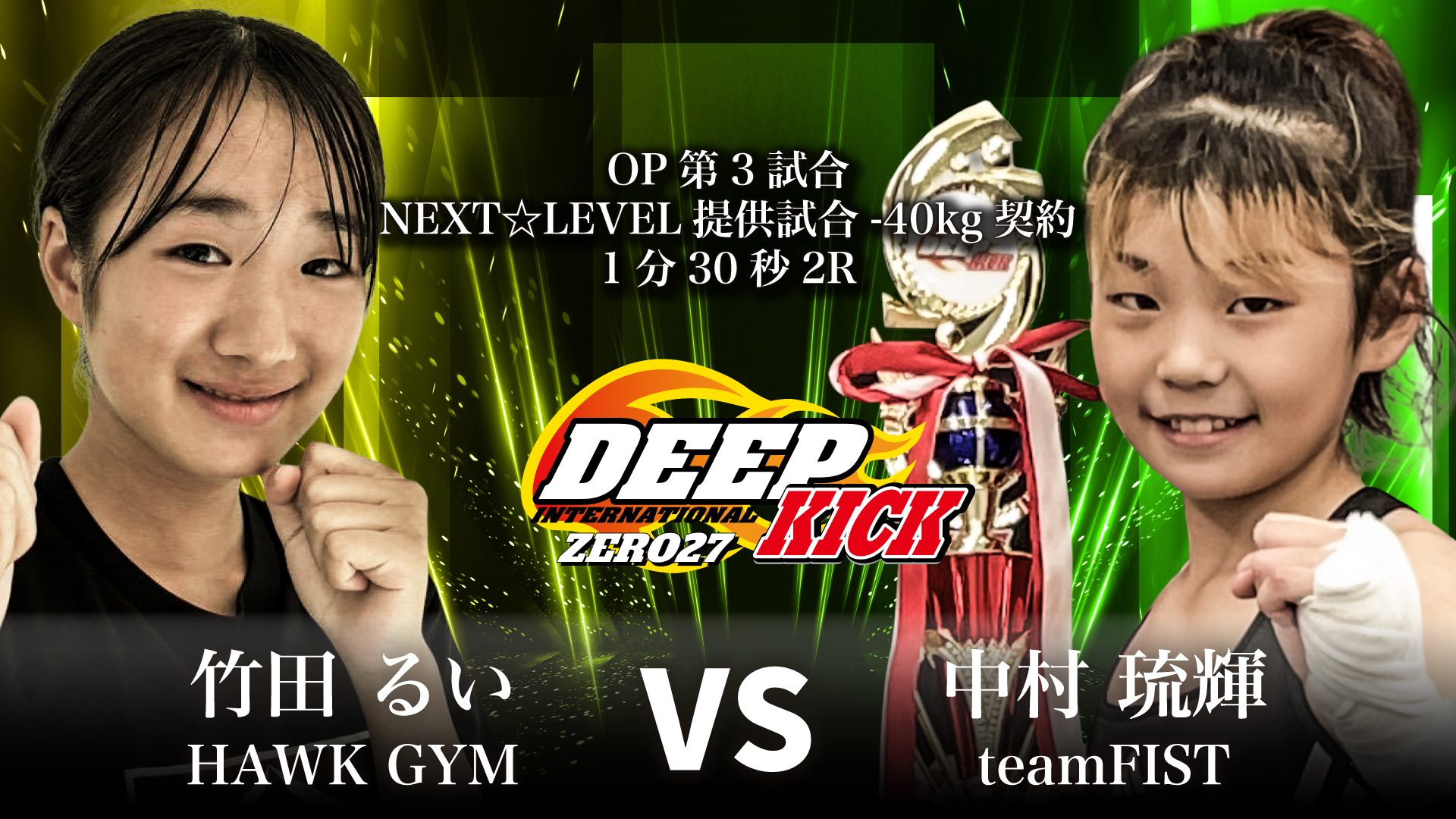 続いて第2部『DEEP☆KICK ZERO 27』ではDEEP☆KICK-55kg契約ワンマッチとして辻岡怜恩(直心会)と善家智哉(FORWARD GYM)の1戦が発表された。
