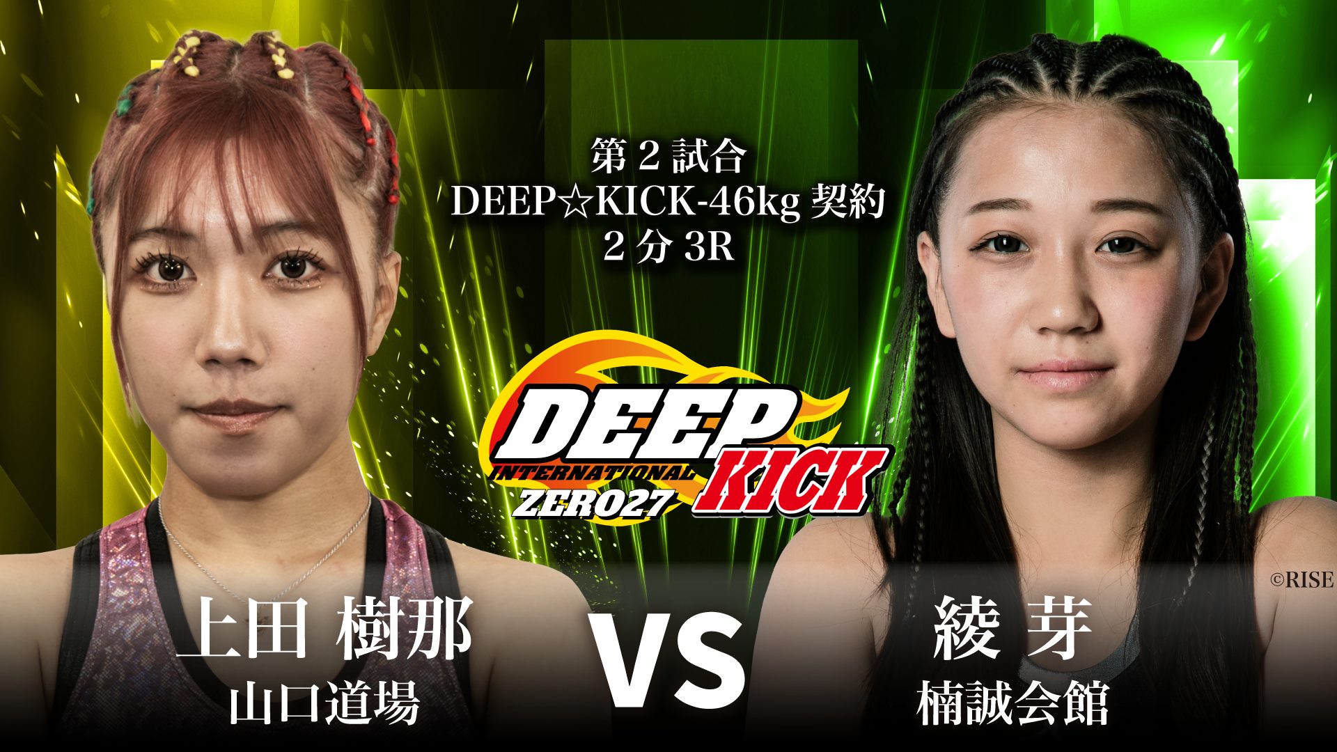 他にはDEEP☆KICK-46kg契約の女子ワンマッチとしてDEEP☆KICKを主戦場に常に激闘を巻き起こす同級7位の上田樹那(山口道場) vs 11月にプロデビューを果たすも判定負け、ここでプロ初勝利を狙う綾芽(楠誠会館)。DEEP☆KICKヘビー級の1戦では両者共に今回がプロデビュー戦となる七夕(木内會) vs 千葉洸大(方上道場)の2戦も発表された。