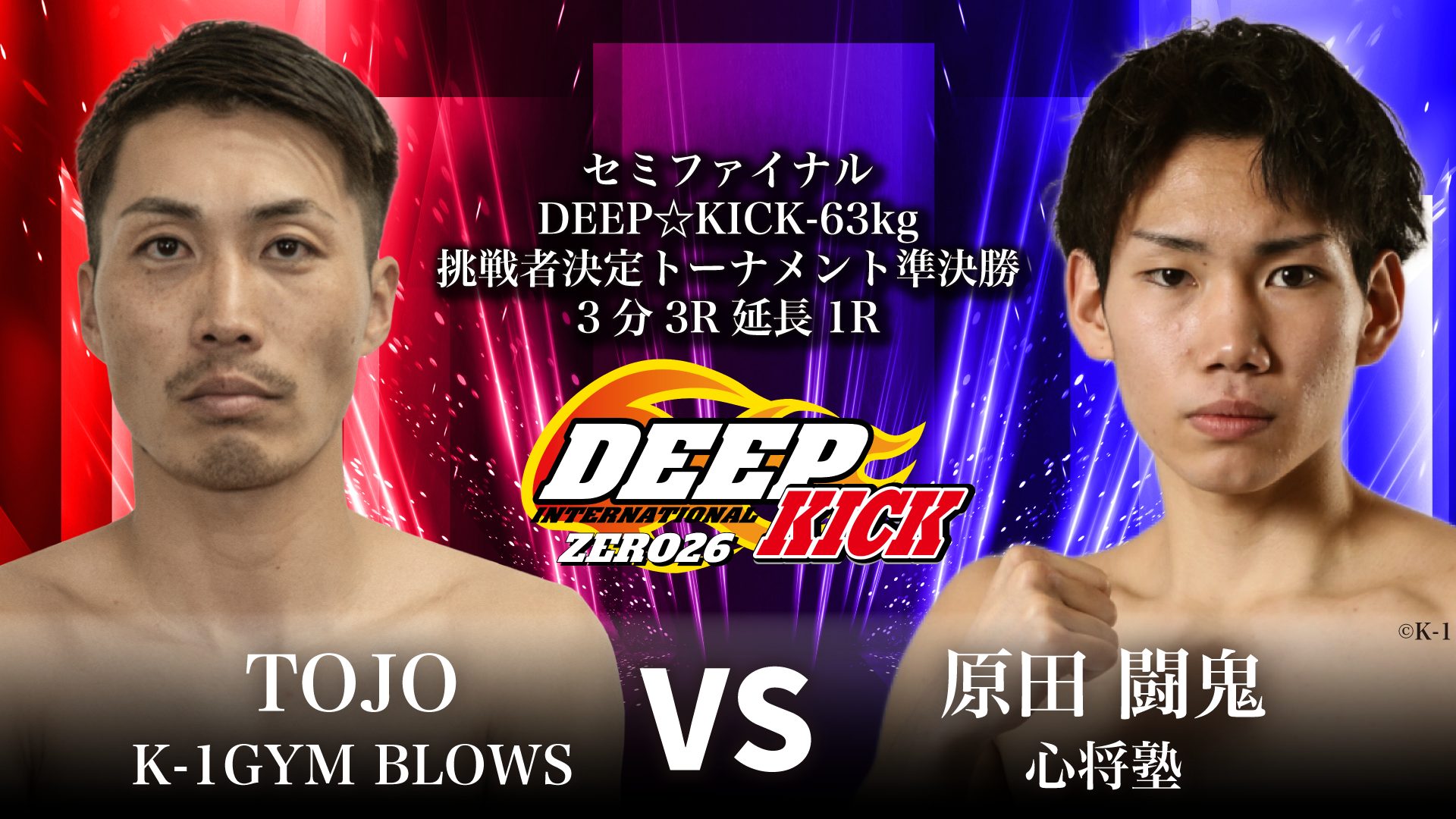 まずは第1部『DEEP☆KICK ZERO 26』、昨年12月にDEEP☆KICK-63kg第7代王者のベルト戴冠を果たし9月には初防衛を飾っている吉岡龍輝(及川道場)の2度目の防衛戦への挑戦権を懸けたDEEP☆KICK-63kg挑戦者決定トーナメントの開催が決定。その1ブロックとしてTOJO(K-1GYM BLOWS)と原田闘鬼(心将塾)が激突する。