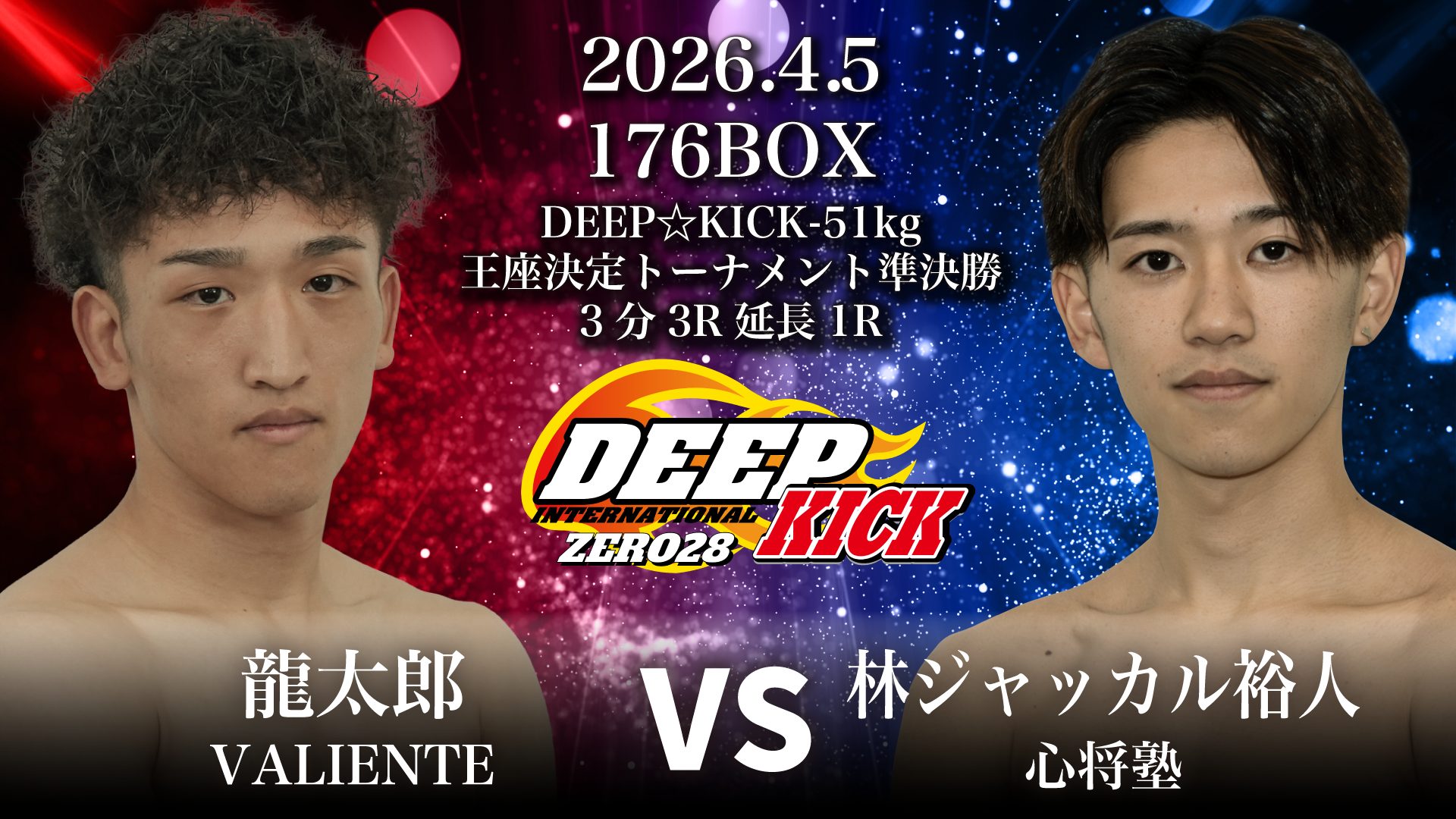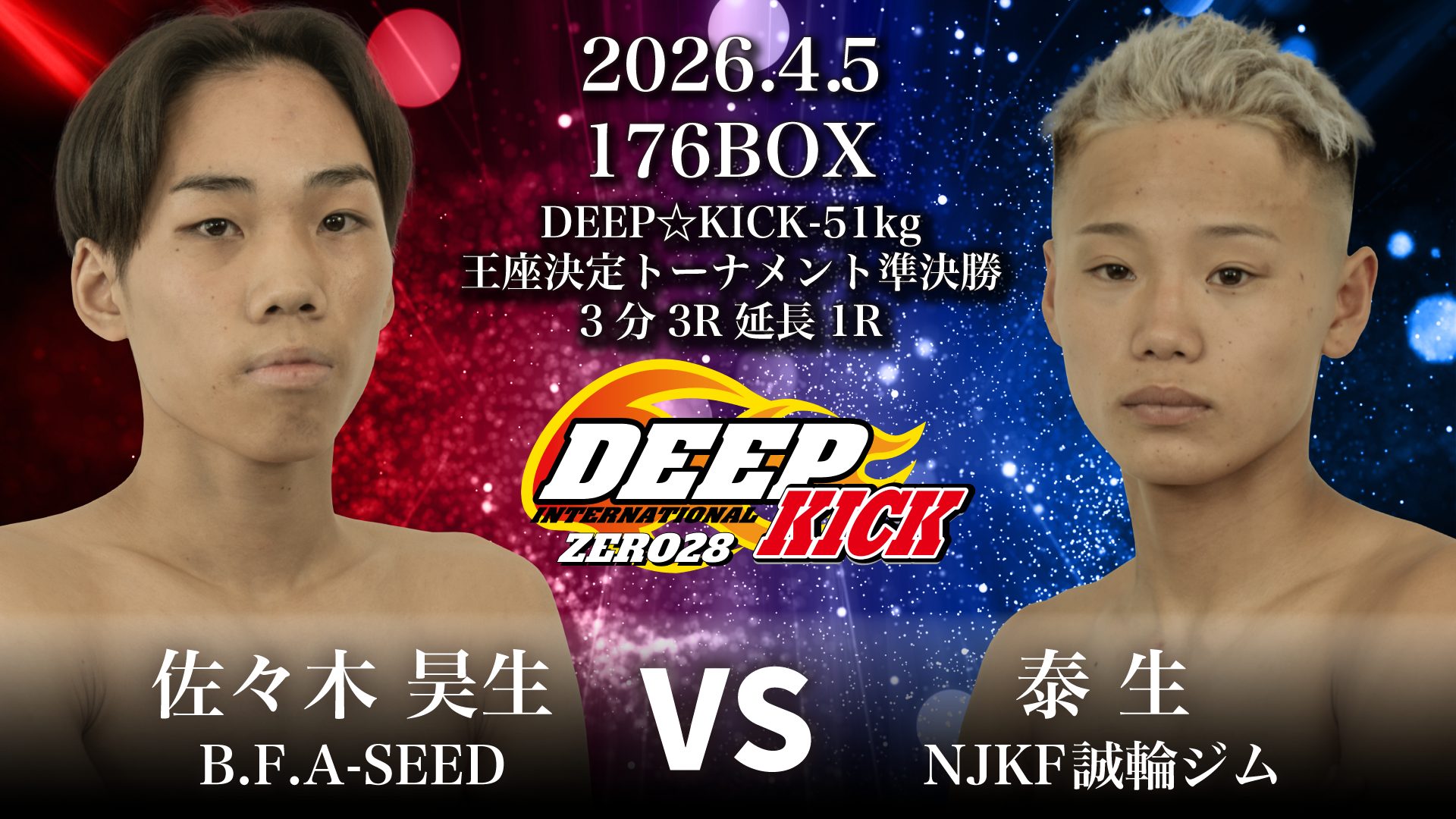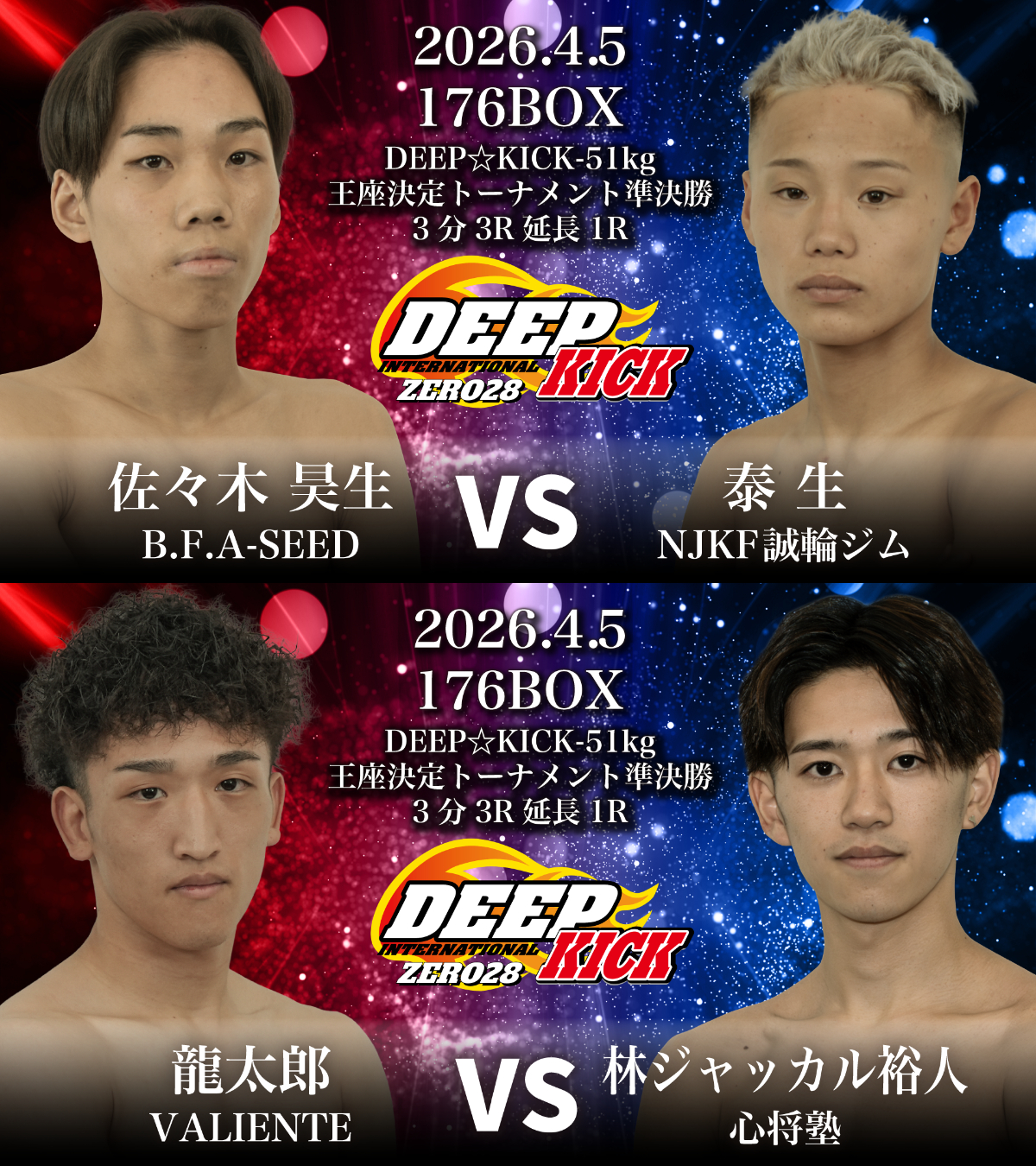 開催されるのは第1部『DEEP☆KICK ZERO 28』。昨年9月にDEEP☆KICK-51kg第5代王者に輝いた松本愛斗(月心会チーム侍)がベルト返上を表明したことにより、第6代王者を懸けたDEEP☆KICK-51kg王座決定トーナメントの開催が決定。対戦するのは同級1位の龍太郎(VALIENTE) vs 同級4位の林ジャッカル裕人(心将塾)、現在プロ負けなしを誇る佐々木昊生(B.F.A-SEED) vs 同級3位の泰生(NJKF誠輪ジム)の4名が決定。内、林・佐々木・泰生の3人は昨年の4月・3月・5月にプロデビューという期待のルーキーが多く集まるトーナメントとなった。