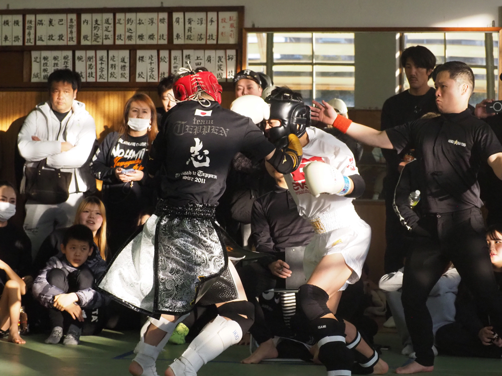 また50kg以下では4名中3名がTEPPEN GYM 大阪から出場、第1戦では大前來虎 ( TEPPEN GYM 大阪 )と長尾杏虹 ( TEPPEN GYM 大阪 )の同門対決が繰り広げられると、前蹴りにインローなどの蹴り技を走らせながらパンチに膝と丁寧に繋ぐ長尾に対し、大前は速く威力の見えるパンチをどんどんと打ち込んでいく。中でも近距離での連打に蹴りは印象的、2R終盤には互いに迫力ある打ち合いを魅せる好ゲームとなったが僅かに大前の攻勢が目立ったか、大前が判定勝利で決勝進出を決めた。またもう1ブロックでは小寺愛斗 ( TEPPEN GYM 大阪 ) vs 阪本皇生 ( Menace Fight Club )が対決、ジャブを突きながら膝にストレートと繰り出す阪本に対し小寺はフェイントを交えながらアグレッシブにストレートにフック、ローにミドル・膝と繰り出していく。2R、阪本はストレートにフック、膝で印象を奪いにいくも小寺はボディにフック、ローなどここでもアグレッシブさは衰えない、そして終了間際にはハイキックをヒットさせ試合終了、結果アグレッシブにヒットを重ねていった小寺が判定勝利を収め決勝進出、これにて50kg以下王座決定戦でもTEPPEN GYM 大阪による同門対決にてベルトが争われることとなった。