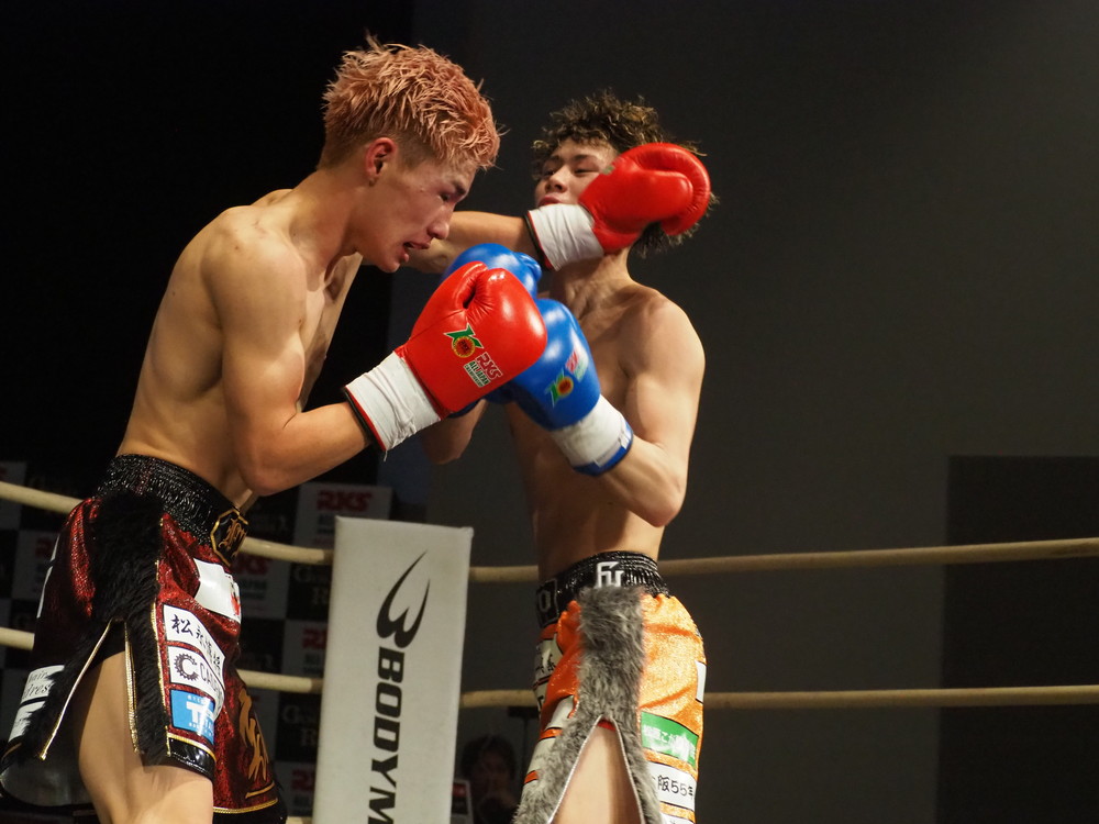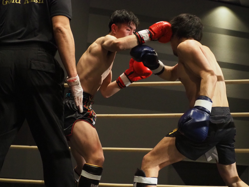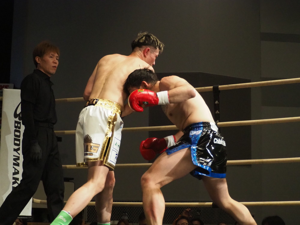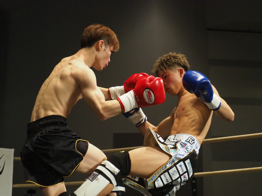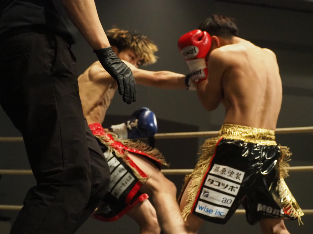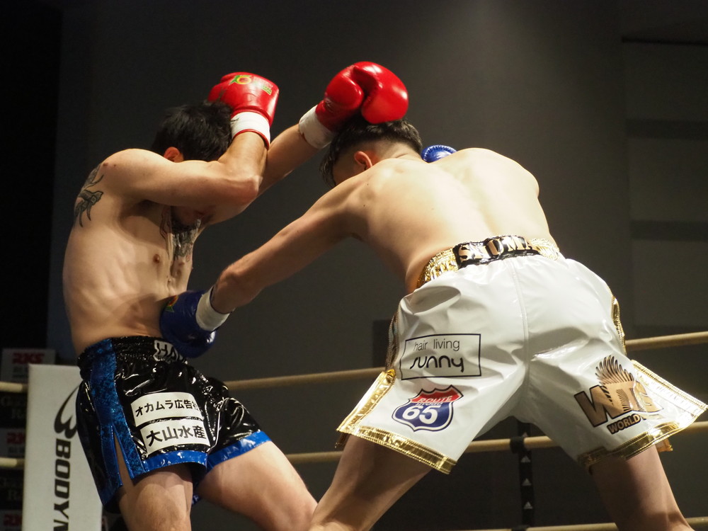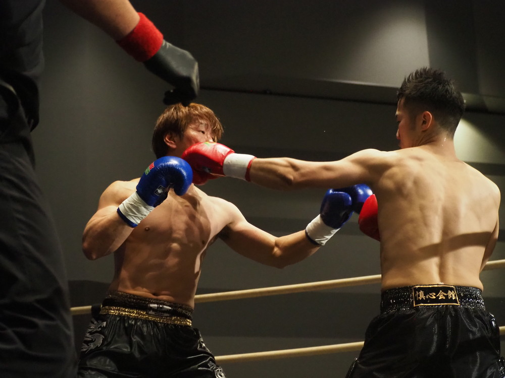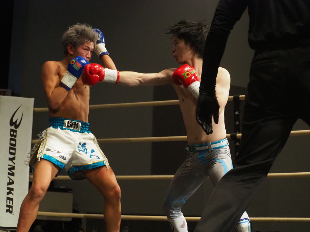 1R、サウスポーに構える小林とオーソドックスの三浦は互いに細かくステップを踏みながらミドル・ハイ、そこからワンツーなどのパンチを狙っていく。互いに最軽量級なだけあって動きが速い、フェイントを交えながら鋭い一撃を放っていく。最中、三浦がローブローを被弾するアクシデント、再開後は小林はスイッチしながらローに被せのストレートをヒットさせれば三浦は圧をかけながらミドル・ハイにフックとこちらも返していくも、ラウンド終盤には再び三浦がローブロー被弾となり長く休憩が取られる。