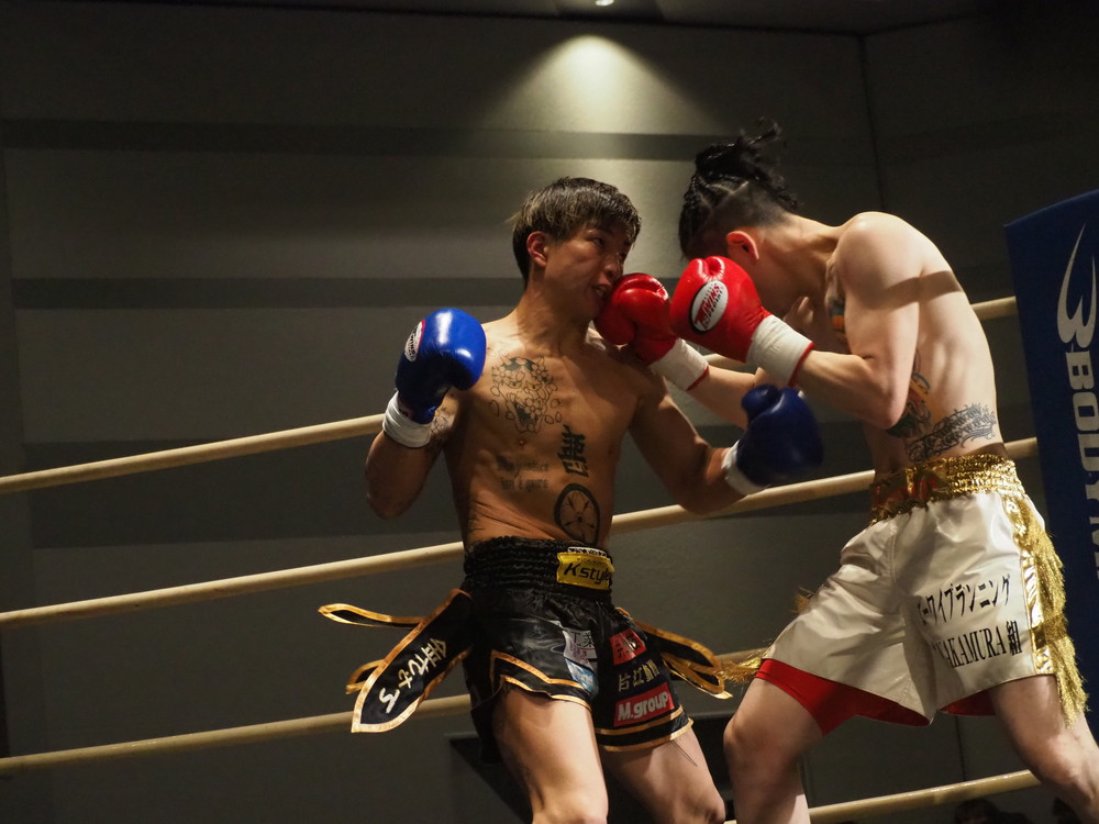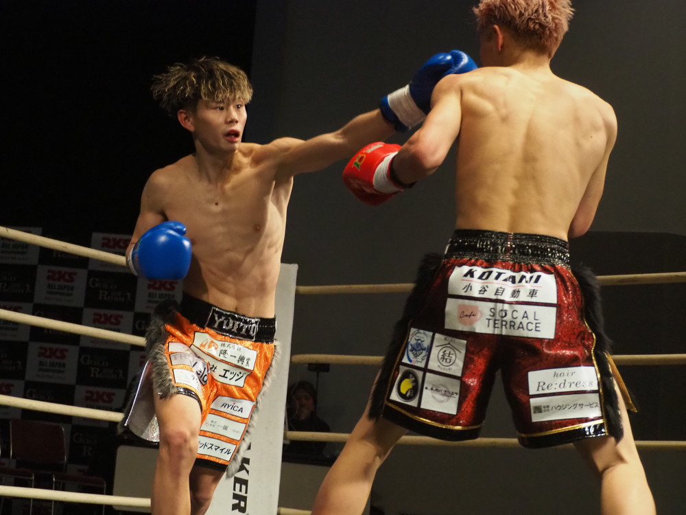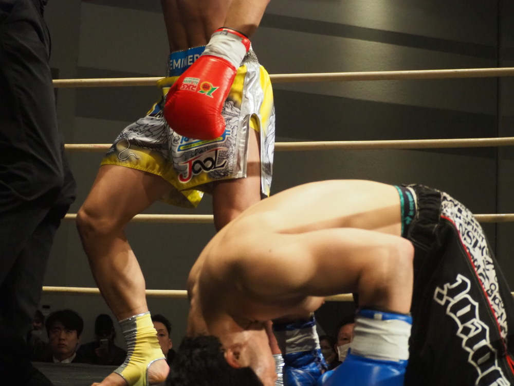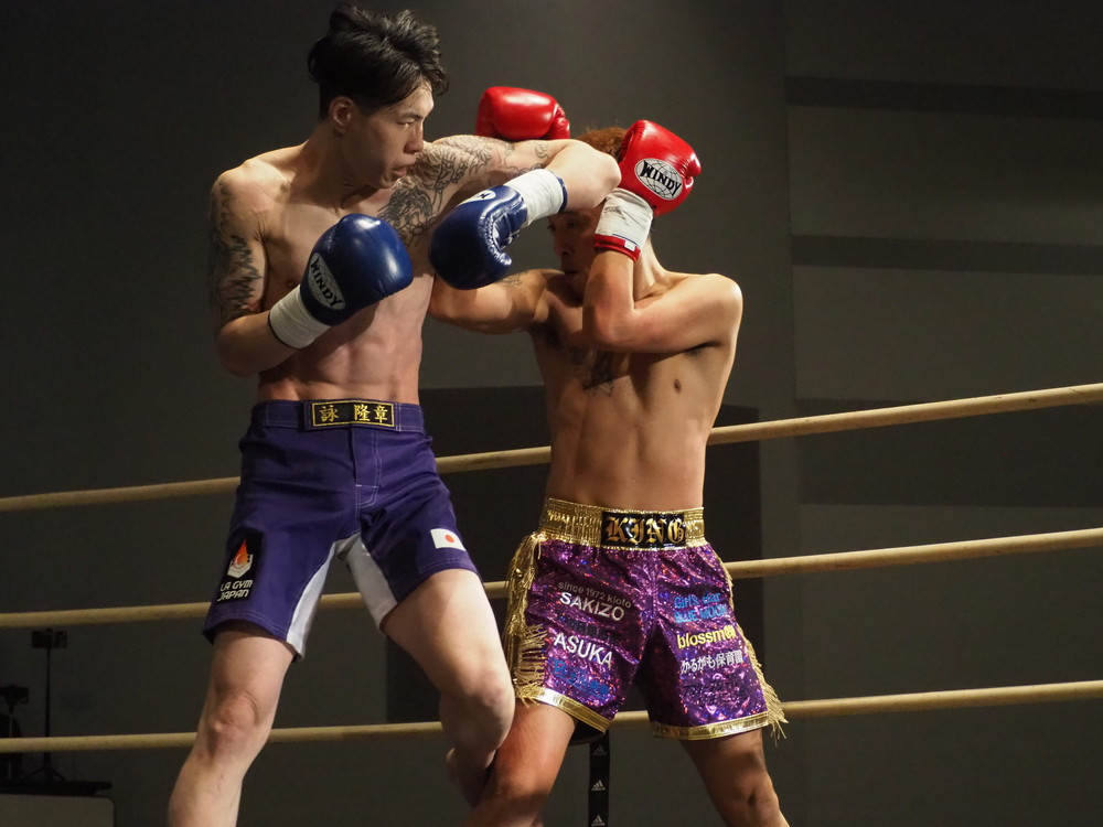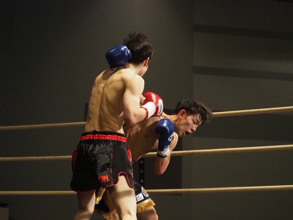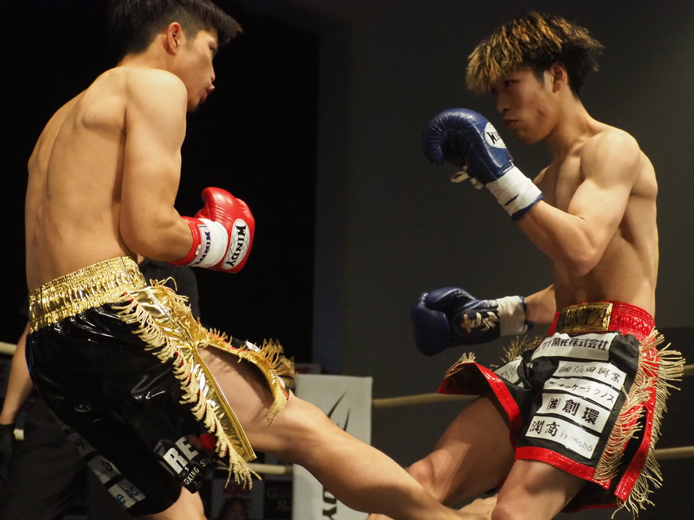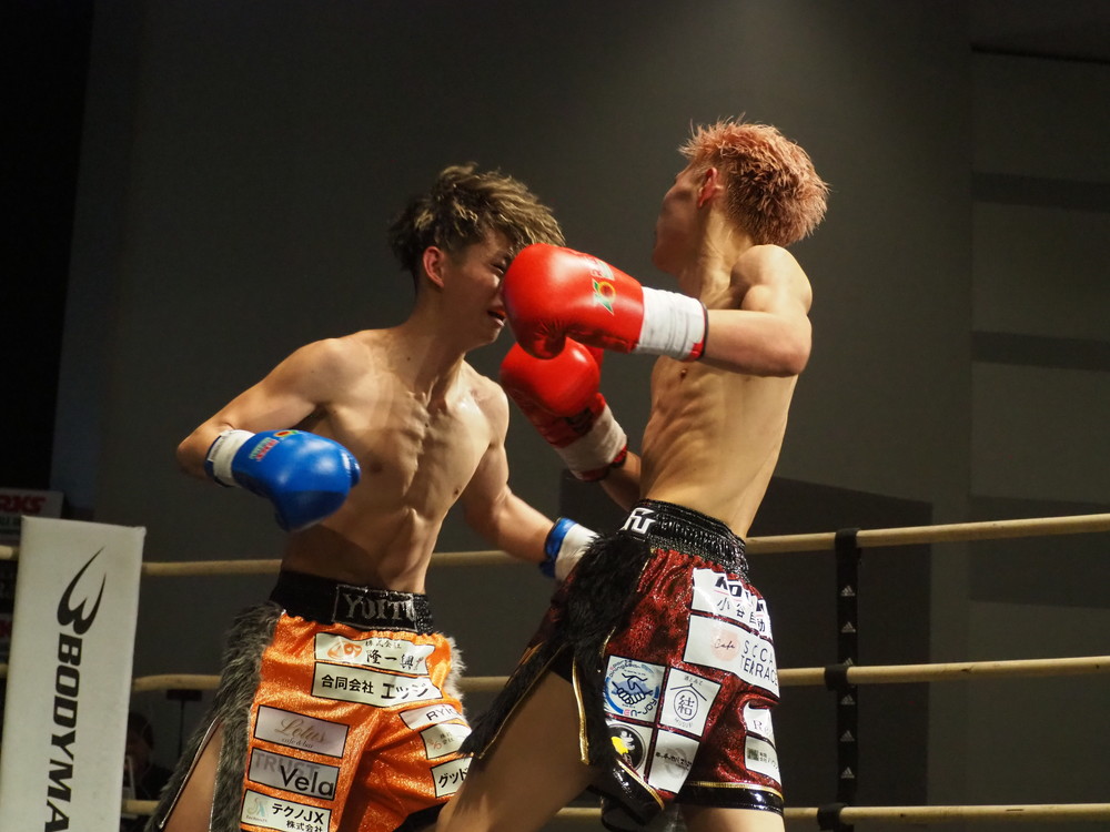 1R、サウスポーに構える小林とオーソドックスの三浦は互いに細かくステップを踏みながらミドル・ハイ、そこからワンツーなどのパンチを狙っていく。互いに最軽量級なだけあって動きが速い、フェイントを交えながら鋭い一撃を放っていく。最中、三浦がローブローを被弾するアクシデント、再開後は小林はスイッチしながらローに被せのストレートをヒットさせれば三浦は圧をかけながらミドル・ハイにフックとこちらも返していくも、ラウンド終盤には再び三浦がローブロー被弾となり長く休憩が取られる。