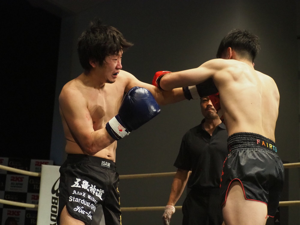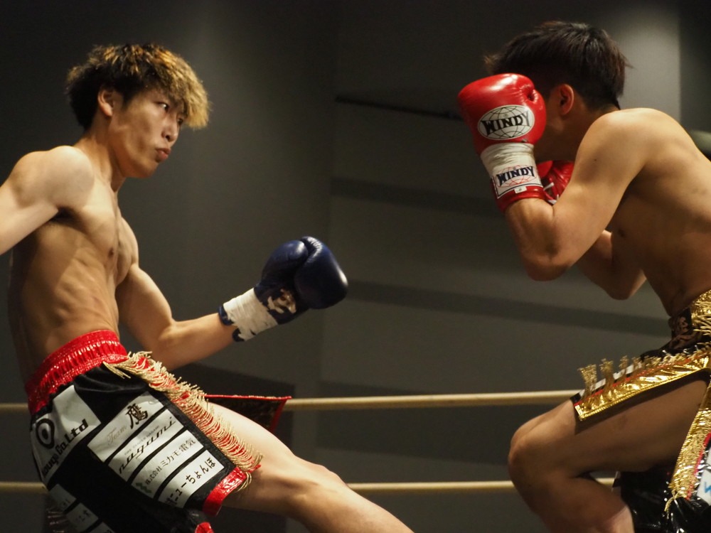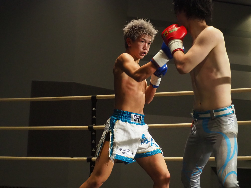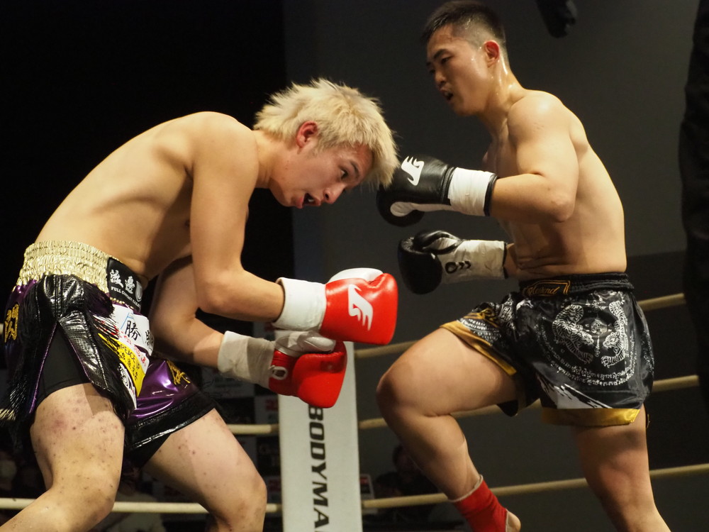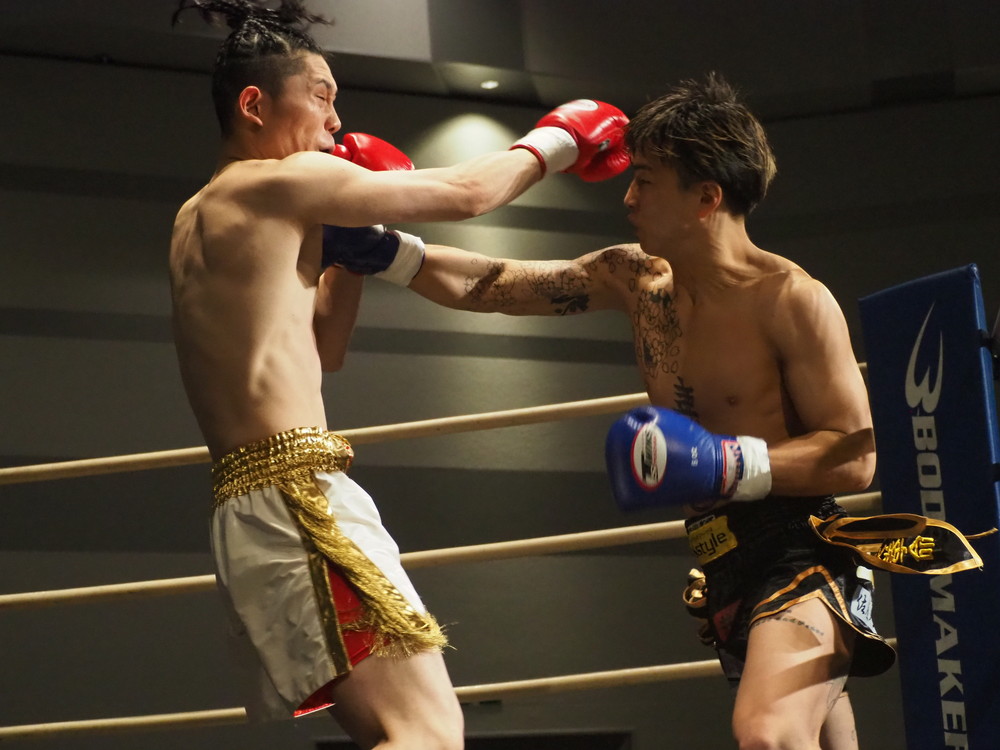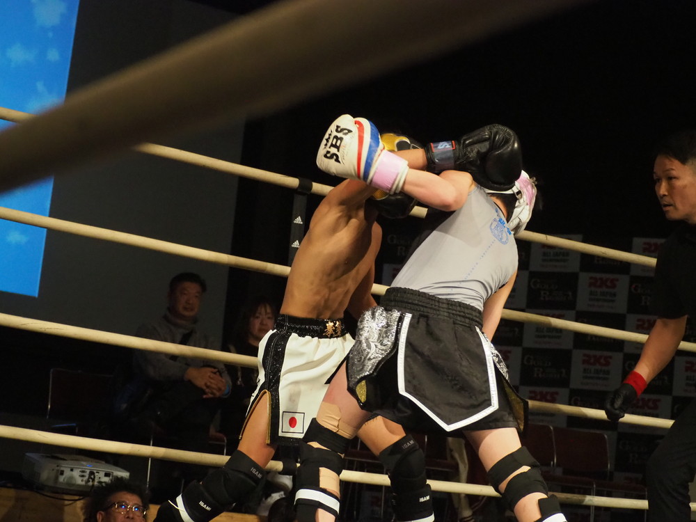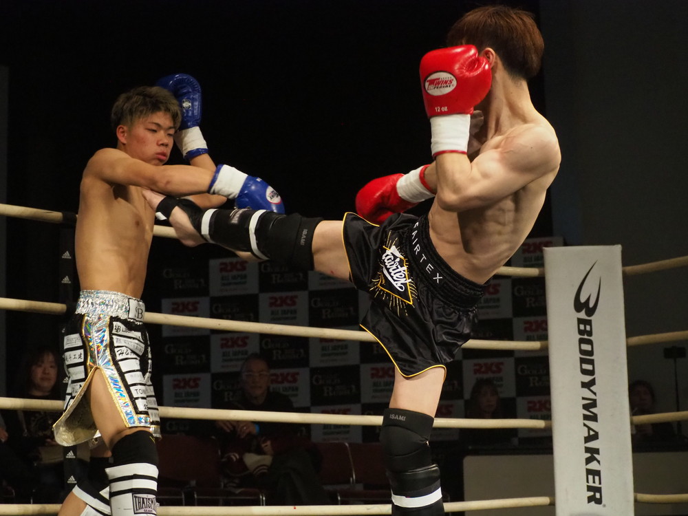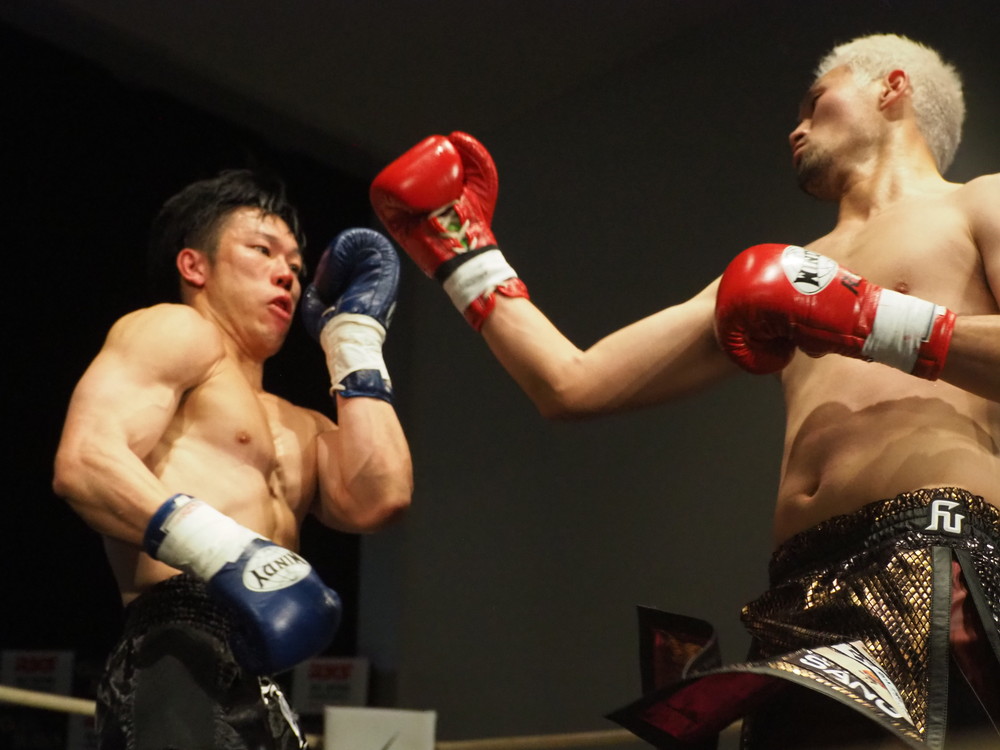 1R、サウスポーに構える小林とオーソドックスの三浦は互いに細かくステップを踏みながらミドル・ハイ、そこからワンツーなどのパンチを狙っていく。互いに最軽量級なだけあって動きが速い、フェイントを交えながら鋭い一撃を放っていく。最中、三浦がローブローを被弾するアクシデント、再開後は小林はスイッチしながらローに被せのストレートをヒットさせれば三浦は圧をかけながらミドル・ハイにフックとこちらも返していくも、ラウンド終盤には再び三浦がローブロー被弾となり長く休憩が取られる。