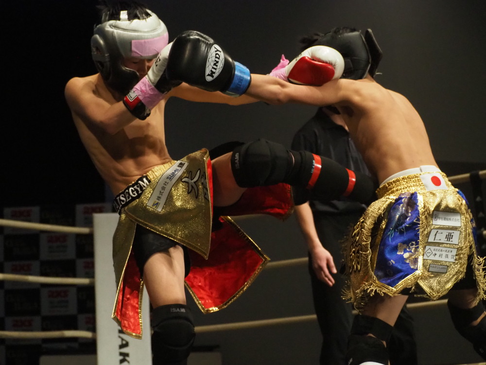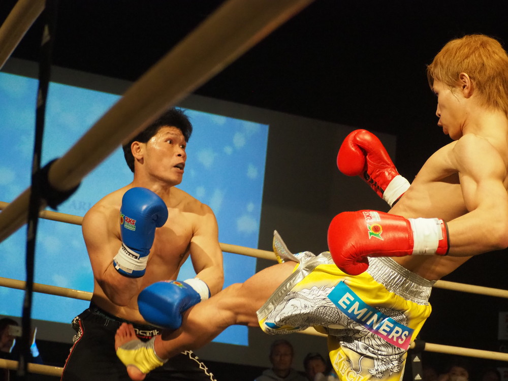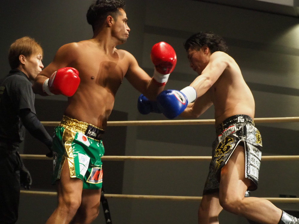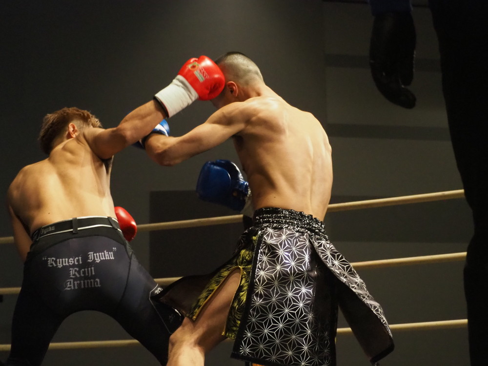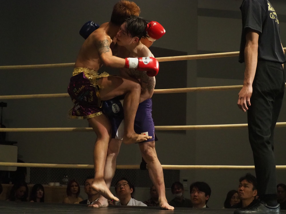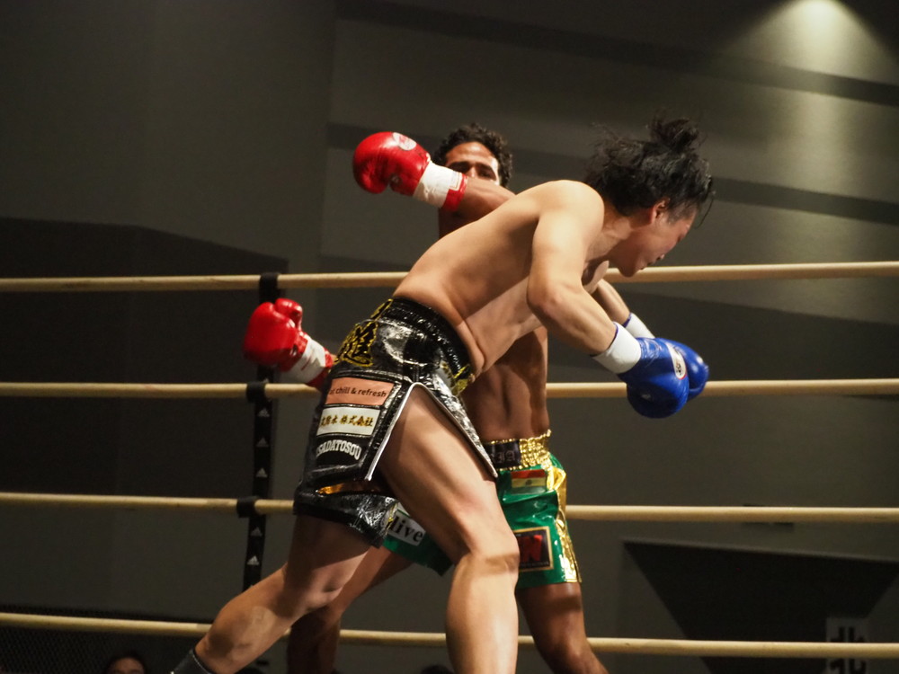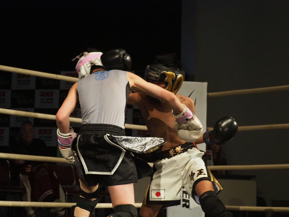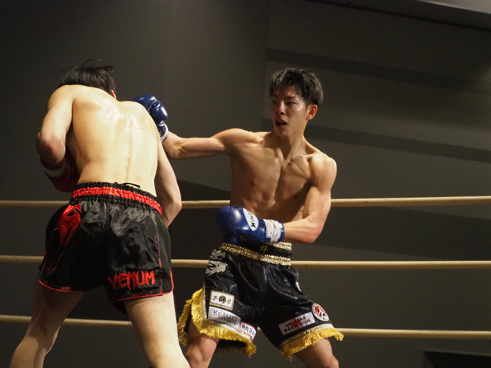 1R、サウスポーに構える小林とオーソドックスの三浦は互いに細かくステップを踏みながらミドル・ハイ、そこからワンツーなどのパンチを狙っていく。互いに最軽量級なだけあって動きが速い、フェイントを交えながら鋭い一撃を放っていく。最中、三浦がローブローを被弾するアクシデント、再開後は小林はスイッチしながらローに被せのストレートをヒットさせれば三浦は圧をかけながらミドル・ハイにフックとこちらも返していくも、ラウンド終盤には再び三浦がローブロー被弾となり長く休憩が取られる。