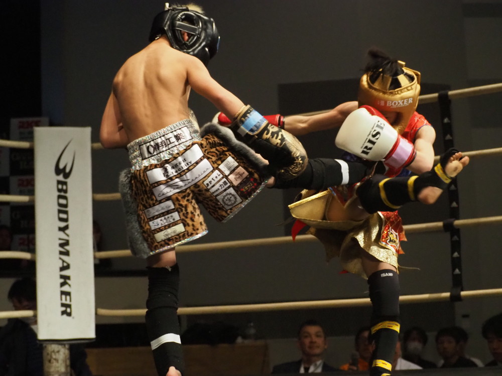 三輪が身長170cmであれば田上は158cmと実に12cmもの身長差がある両者。果たして1R、サウスポーから左ミドルに左ハイと左の蹴り技を絶え間なく放つ三輪、対する田上は体制低く構えながら入りどころを伺い左右のフックを打ち込む。細かく動きながらスイッチにフェイントなどを入れ込む田上だが中に入り切れないこともあり手数は少ない。そして三輪は冷静そのもの、自身の距離を保ちながら左ミドル・左前蹴り・左ハイをこれでもかと打ち込んでいく。田上も状況を打開したい所だったが後半は防戦一方になってしまう、1Rは距離を完全に支配し蹴り続けた三輪のラウンドだ。