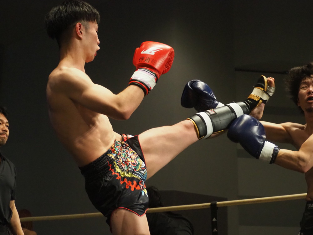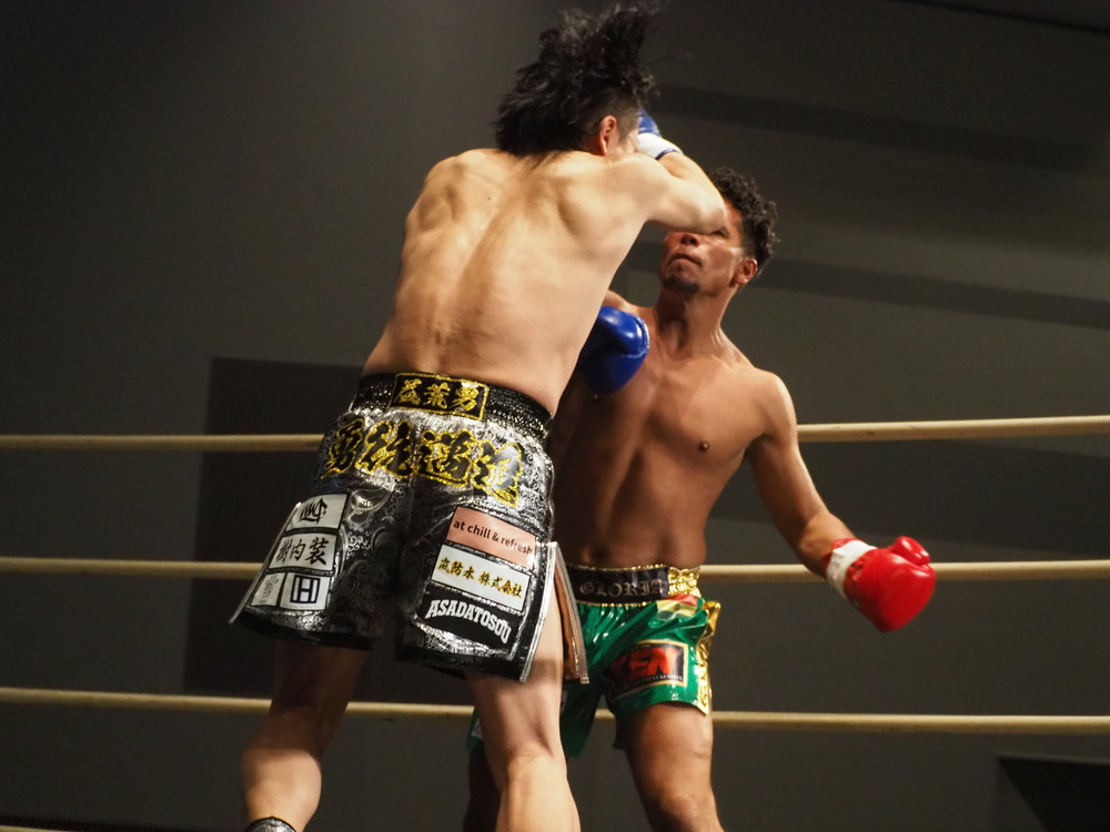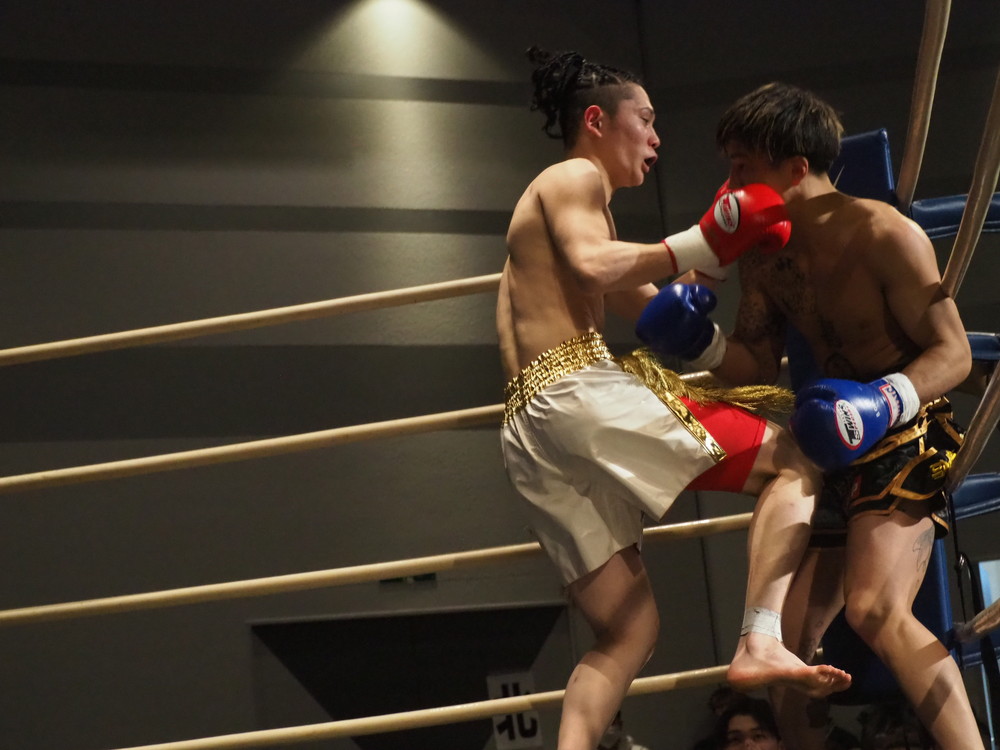 続く2R、早々から左フックにストレートで距離を詰めパンチの打ち合いに持ち込む唯斗、刻もそれに応じるがパンチの打ち合いではやや唯斗に分がある印象だ。しかし刻も冷静、1R同様にカーフキックを随所でヒットさせていき、そこからリング中央に陣取り圧をかけ状況を立て直す。唯斗はコーナーを背負わされる展開が増えるも左フック・ストレートが冴えわたり印象的なヒットをよく奪う。対する刻も気持ちが強い、ヒットなどお構いなしにすぐにカーフにストレートと打ち返す一進一退の好ゲームが続いていく。