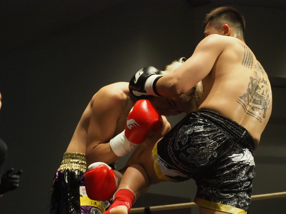 EXラウンド、マスト判定のためこのラウンドで必ず決着がつく。大きな歓声の中、ゴングが打ち鳴らされると早々から互いにパンチでこれでもかと打ち合っていく。刻がどんどん前に踏み込みながら左右のフック、そして膝と打ち込んでいけば唯斗は前蹴りにワンツー連打でこちらも打ち返していく。徐々に組み付きの展開も増え疲れは明らか、しかし会場の大声援を背に2人は止まらず打ち出ていく。そしてヒットしヒットされという展開は最後まで続いていき大歓声の元試合終了を迎える。