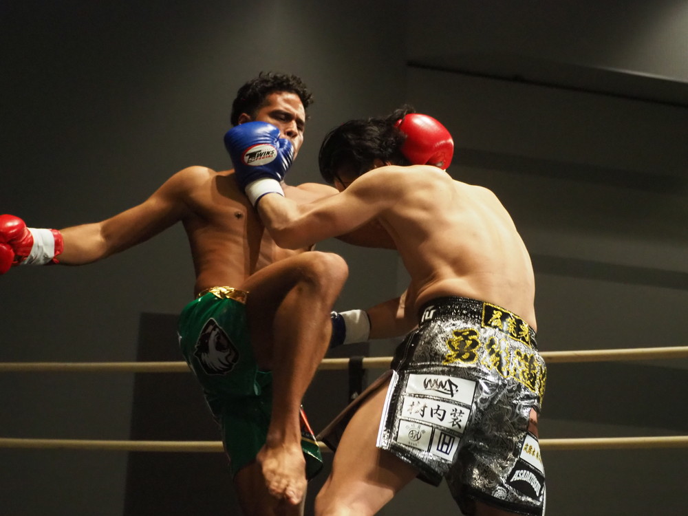 1R、サウスポーに構える有馬は前手でジャブを突きながら左のローにミドル・前蹴りと繰り出していく。対する貴之は序盤こそ左右のフックを打ち出すもラウンド中盤には有馬が距離を支配したこともあり手数が減っていく。そこから有馬は貴之の前足にローを集めながら左ストレートを強襲、貴之はミドルに体制を低くして放つ威力あるフックを打ち込むも距離が合わないか、空振りが目立つ印象だ。1Rは有馬のラウンドだろう。