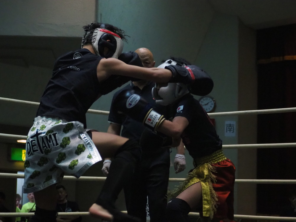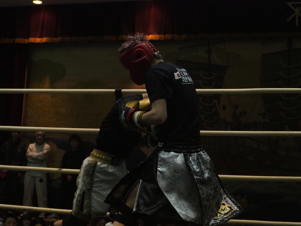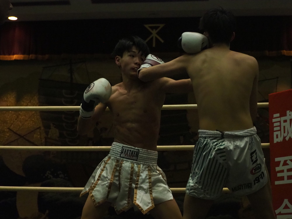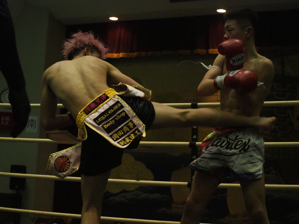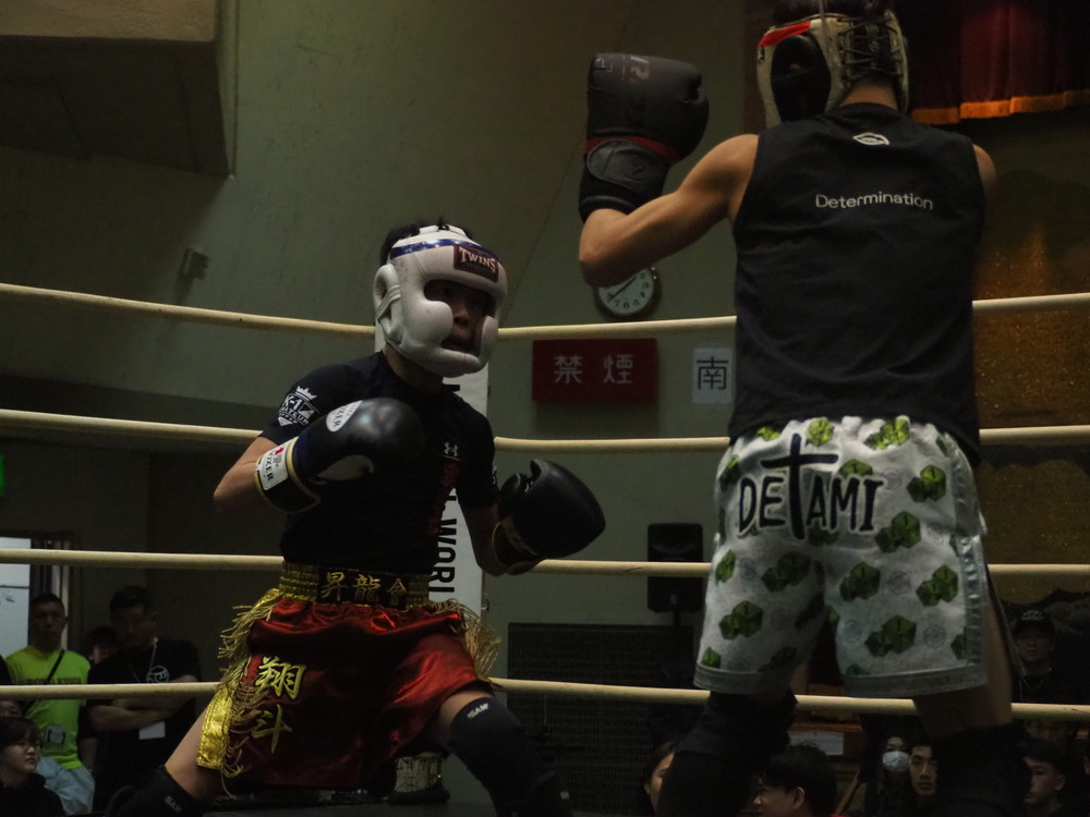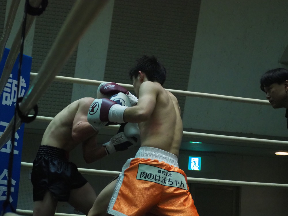 1R、滑飛はローを走らせながらワンツーに右ハイ、フックと鋭い攻撃を繰り出していく。対する越野はサウスポーに構え、ストレートにボディ・首相撲とリズムよくアグレッシブに繰り出す。中でも越野の右フックは素晴らしい、印象的なヒットを重ねていくと1R終盤にはその右フックでダウン奪取。滑飛もアグレッシブさを見せるも越野のリズム、何より右フックで1Rはダウンも合わさり越野が優勢に。
