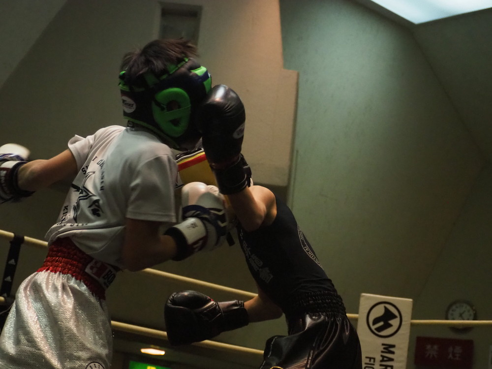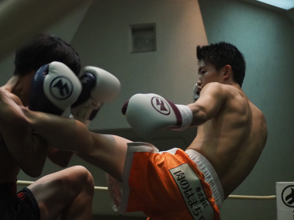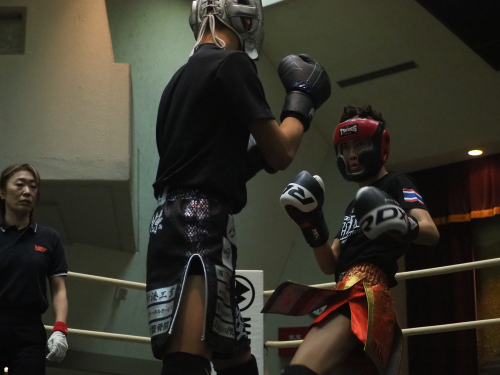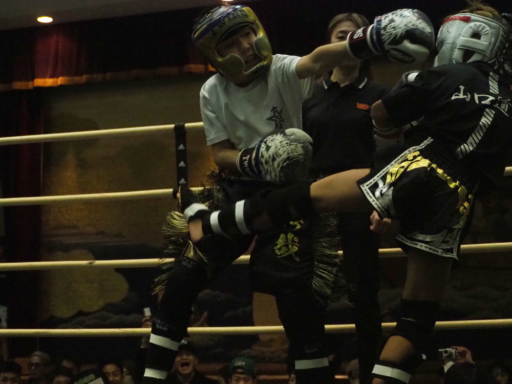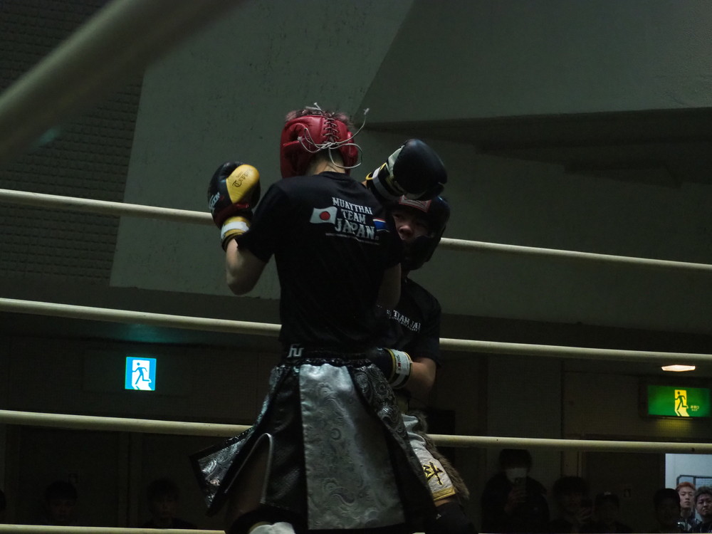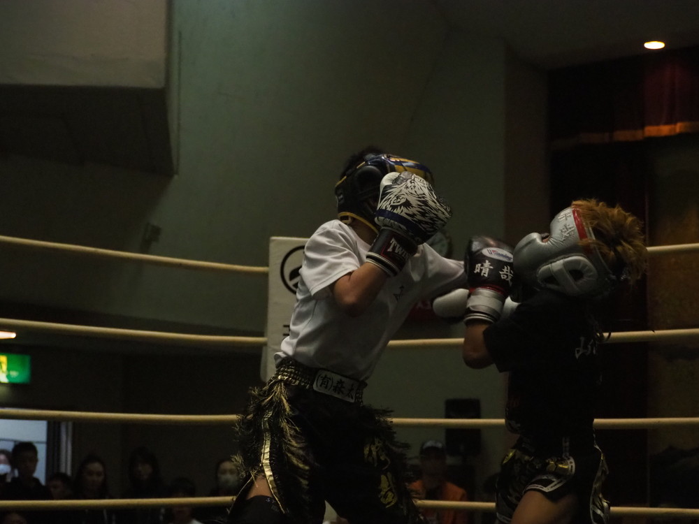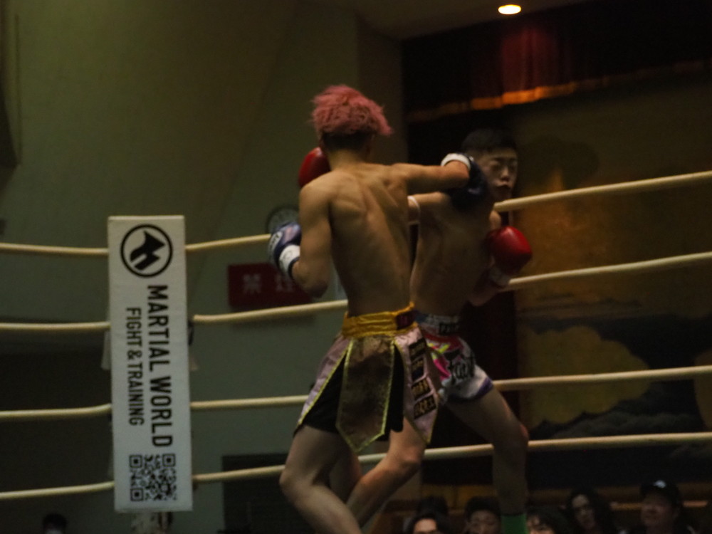 1R、滑飛はローを走らせながらワンツーに右ハイ、フックと鋭い攻撃を繰り出していく。対する越野はサウスポーに構え、ストレートにボディ・首相撲とリズムよくアグレッシブに繰り出す。中でも越野の右フックは素晴らしい、印象的なヒットを重ねていくと1R終盤にはその右フックでダウン奪取。滑飛もアグレッシブさを見せるも越野のリズム、何より右フックで1Rはダウンも合わさり越野が優勢に。