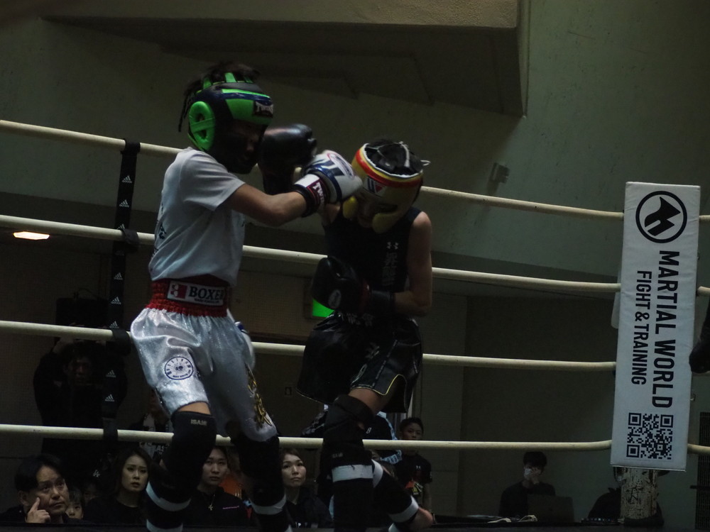 続く2R、巻き返しを図りたい滑飛だが、ここでも再び越野はカウンターの右フックで1Rに続き2度目のダウンを奪う。ダメージは深くないか、再開後にラッシュをかけていく越野に左フック・ストレートと動きは落とさずしっかり返していく滑飛。ラウンド終盤にはバックハンドブローをヒットさせるなど折れない強さを見せつけるがダウンで失ったポイントは大きい、2R終了時点でのオープンスコアは3者共に20-16で越野を支持。