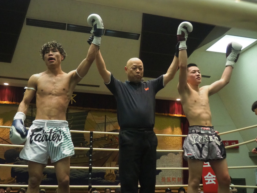 最終ラウンド、勝つにはKOしかない滑飛は早々から圧をかけていくが、その勢いを越野はアグレッシブさで上回っていく。中盤からは左フックにストレート・ハイキックで逆転を狙っていく滑飛だが越野は入ってきたところに右フック・ストレート、そして首相撲で捕まえて膝と着実に対処していく。後半には互いに疲れが見える中、最後までアグレッシブな攻めの姿勢を見せた滑飛だったがここでも越野の攻勢が目立ち試合終了。結果、1・2Rには右フックでダウンを奪い、そして3Rを制圧した越野がフルマークの判定勝利を収め無傷のプロ3勝目を勝ち取った。