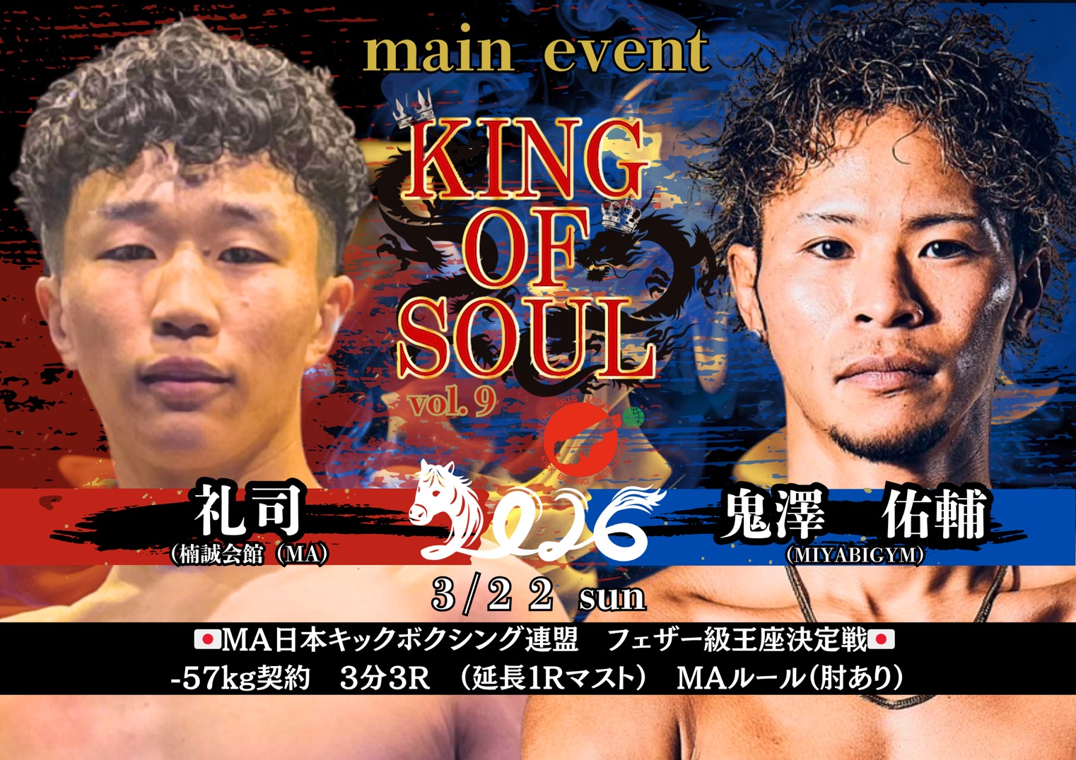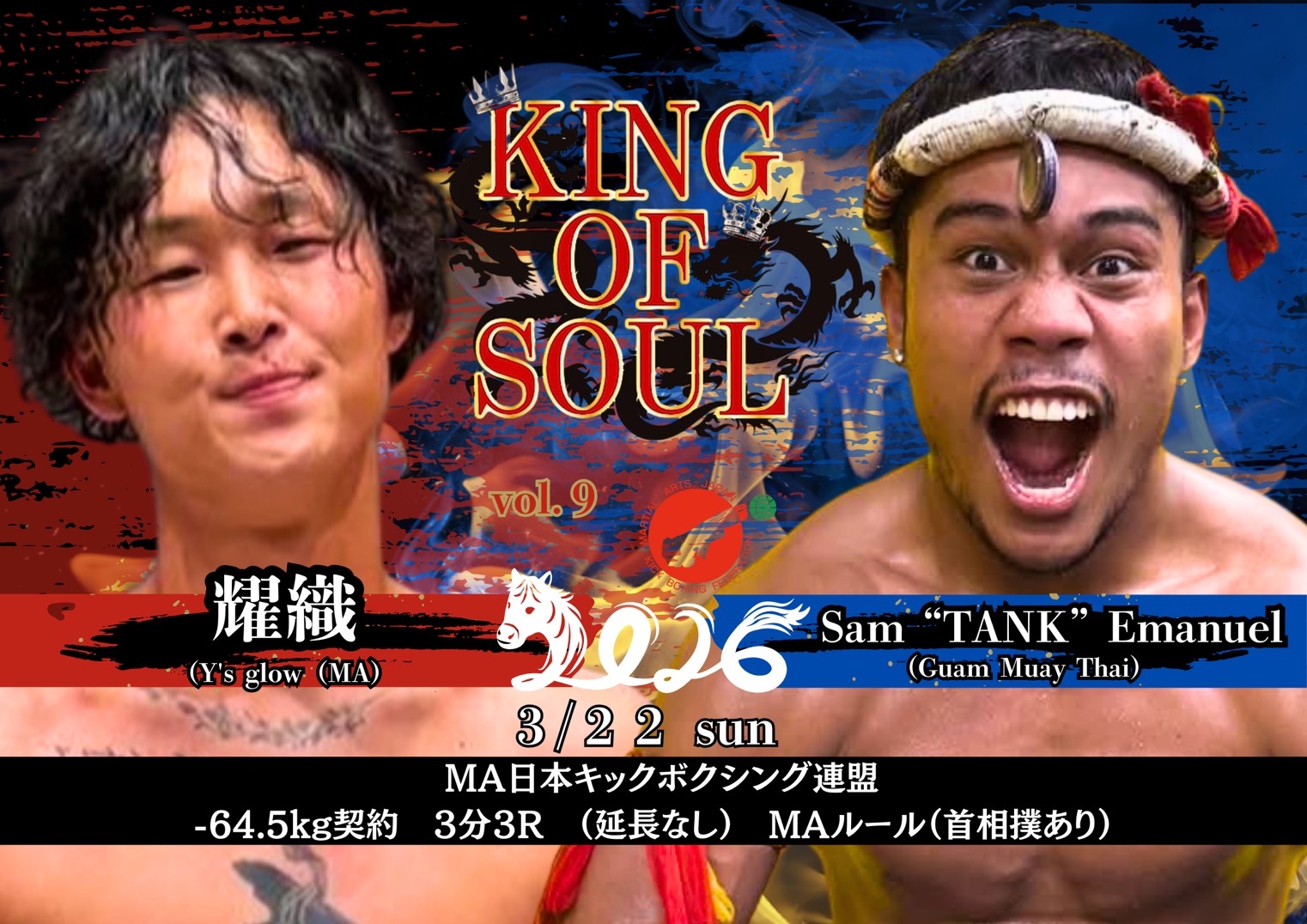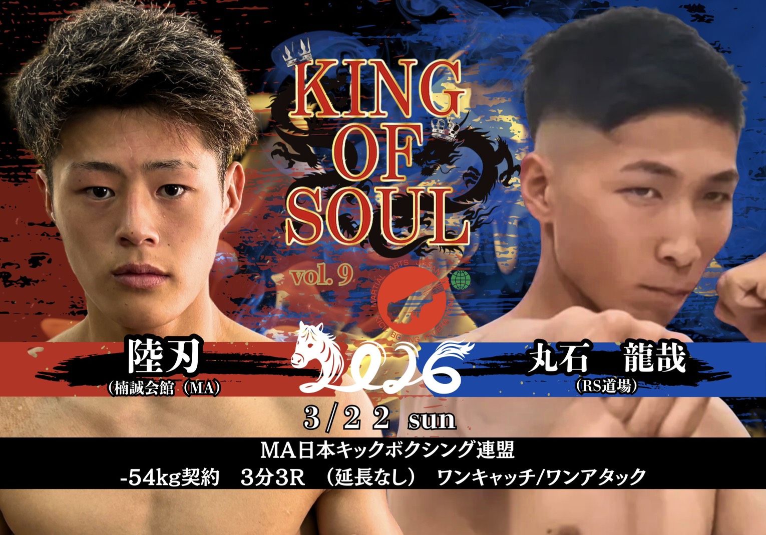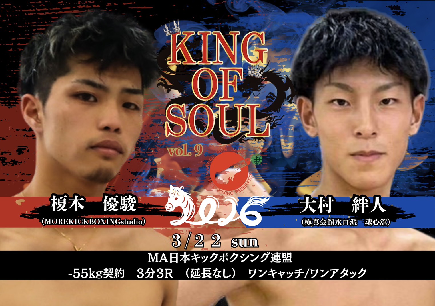 2026年3月22日(日)大阪・世界館にて開催されるMA日本キックボクシング連盟認定大会『KING OF SOUL:Vol.9』の全対戦カードが発表された。