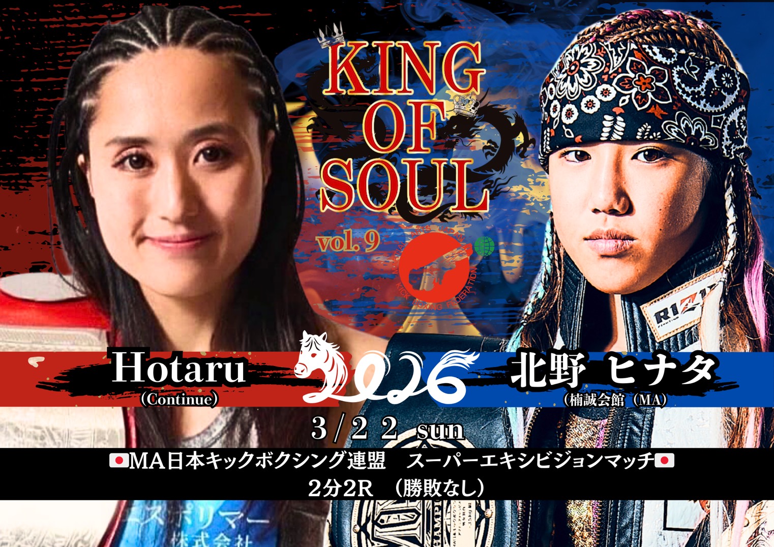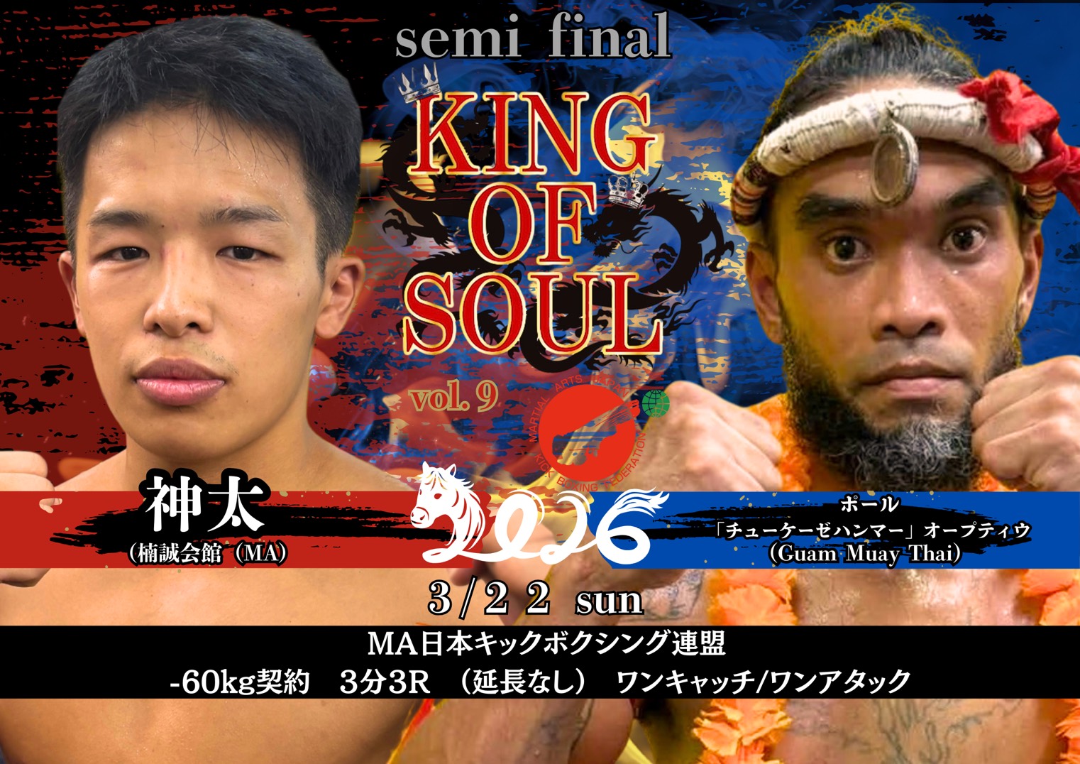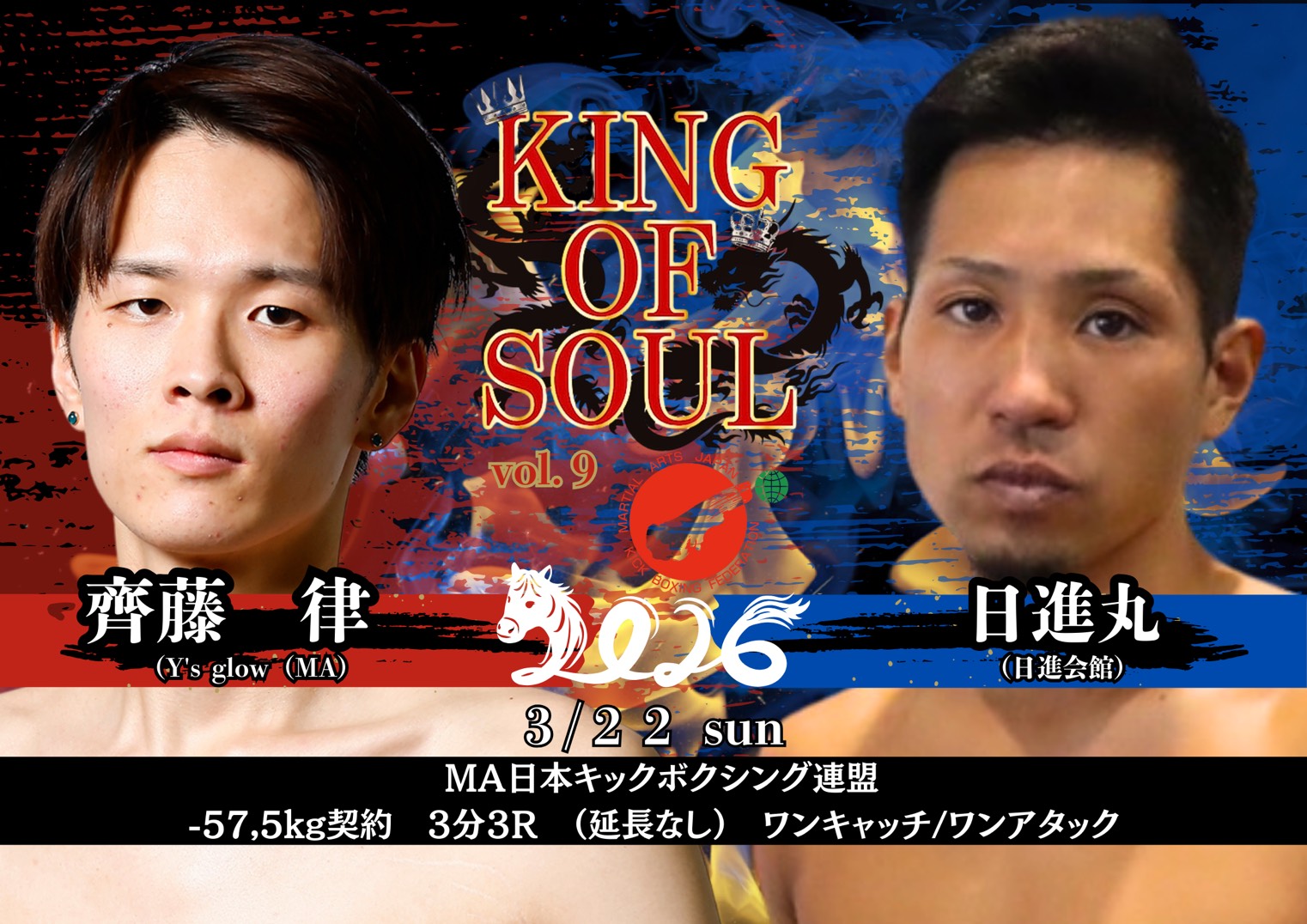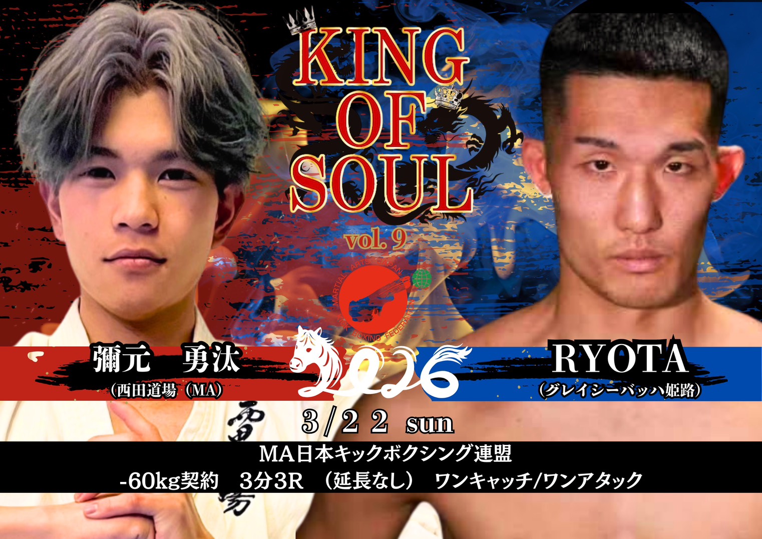 2026年3月22日(日)大阪・世界館にて開催されるMA日本キックボクシング連盟認定大会『KING OF SOUL:Vol.9』の全対戦カードが発表された。
