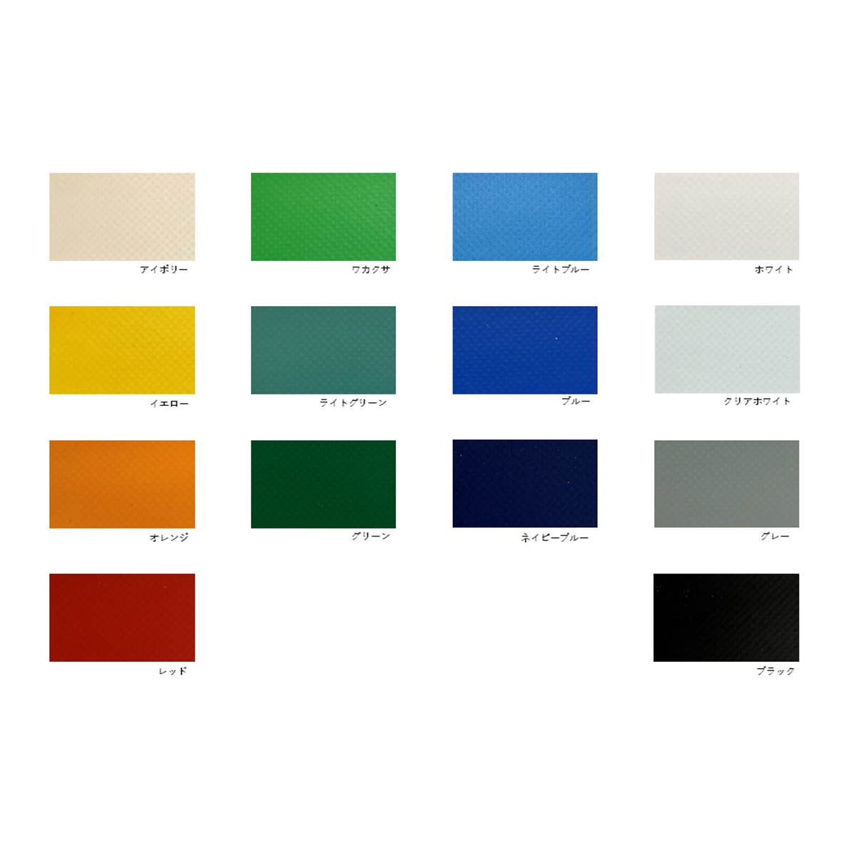 ブラック、ブルー、レッド、ホワイト、アイボリー、イエロー、オレンジ、ワカクサ、ライトグリーン、グリーン、ライトブルー、ネイビーブルー、クリアホワイト、グレー