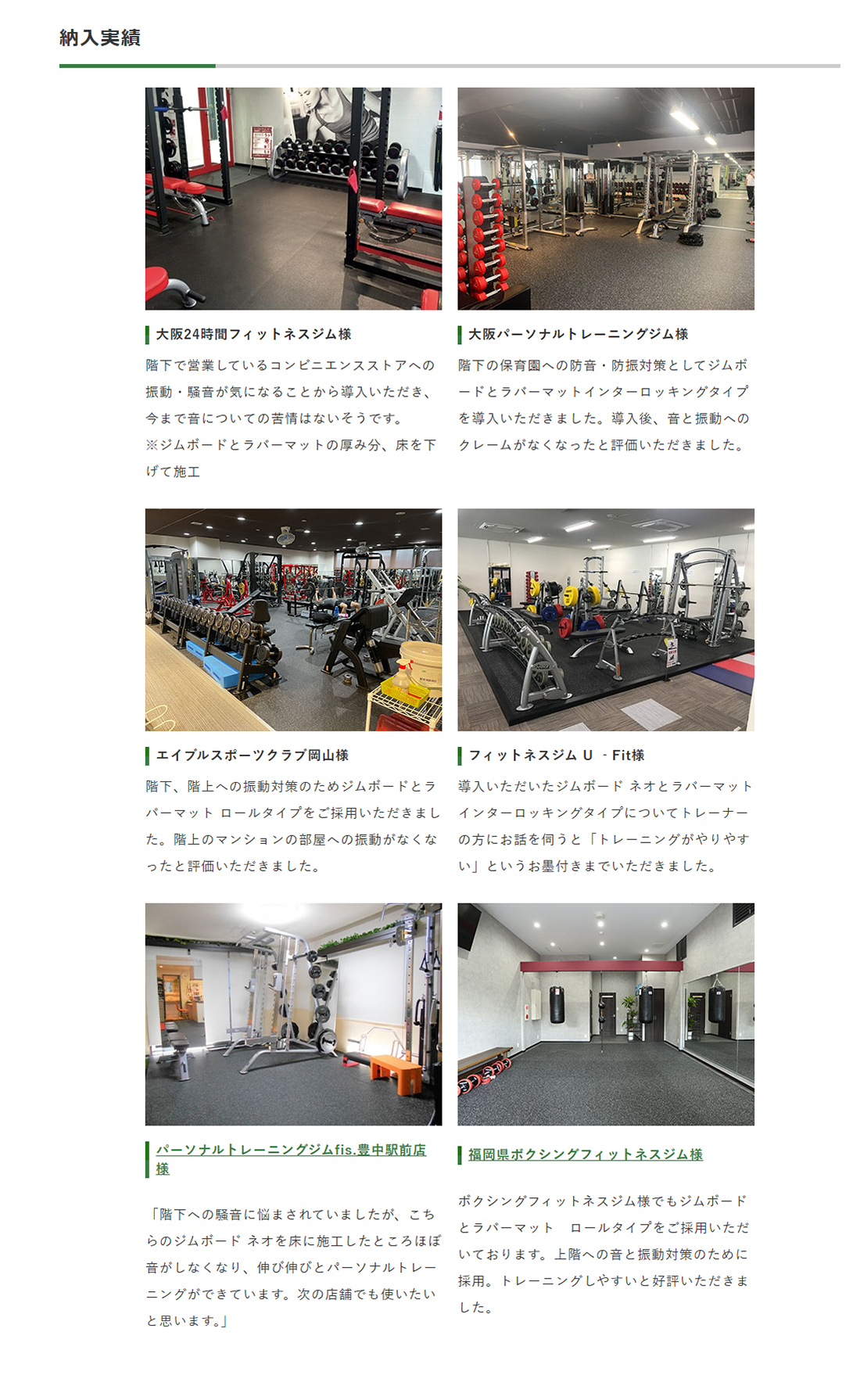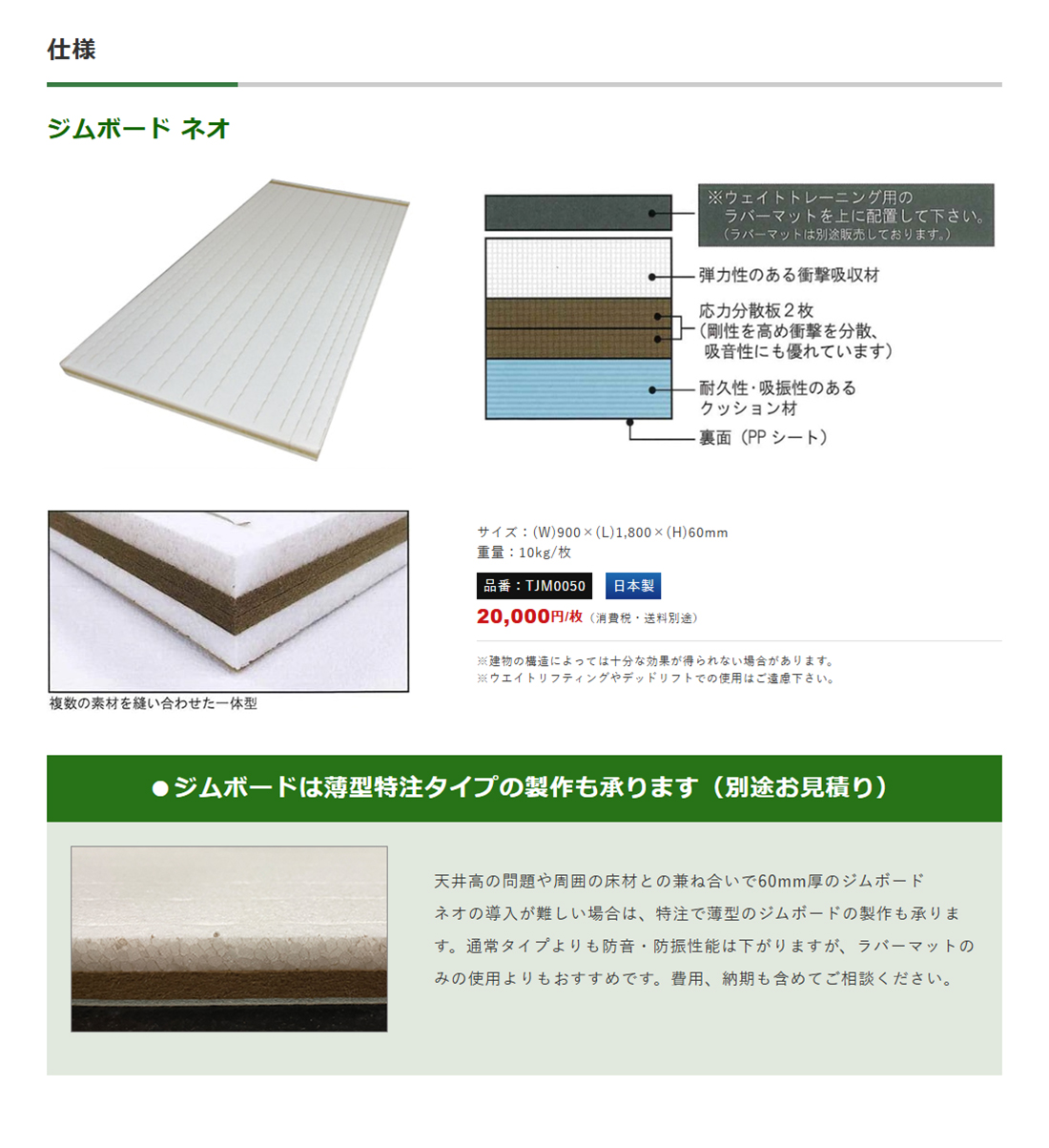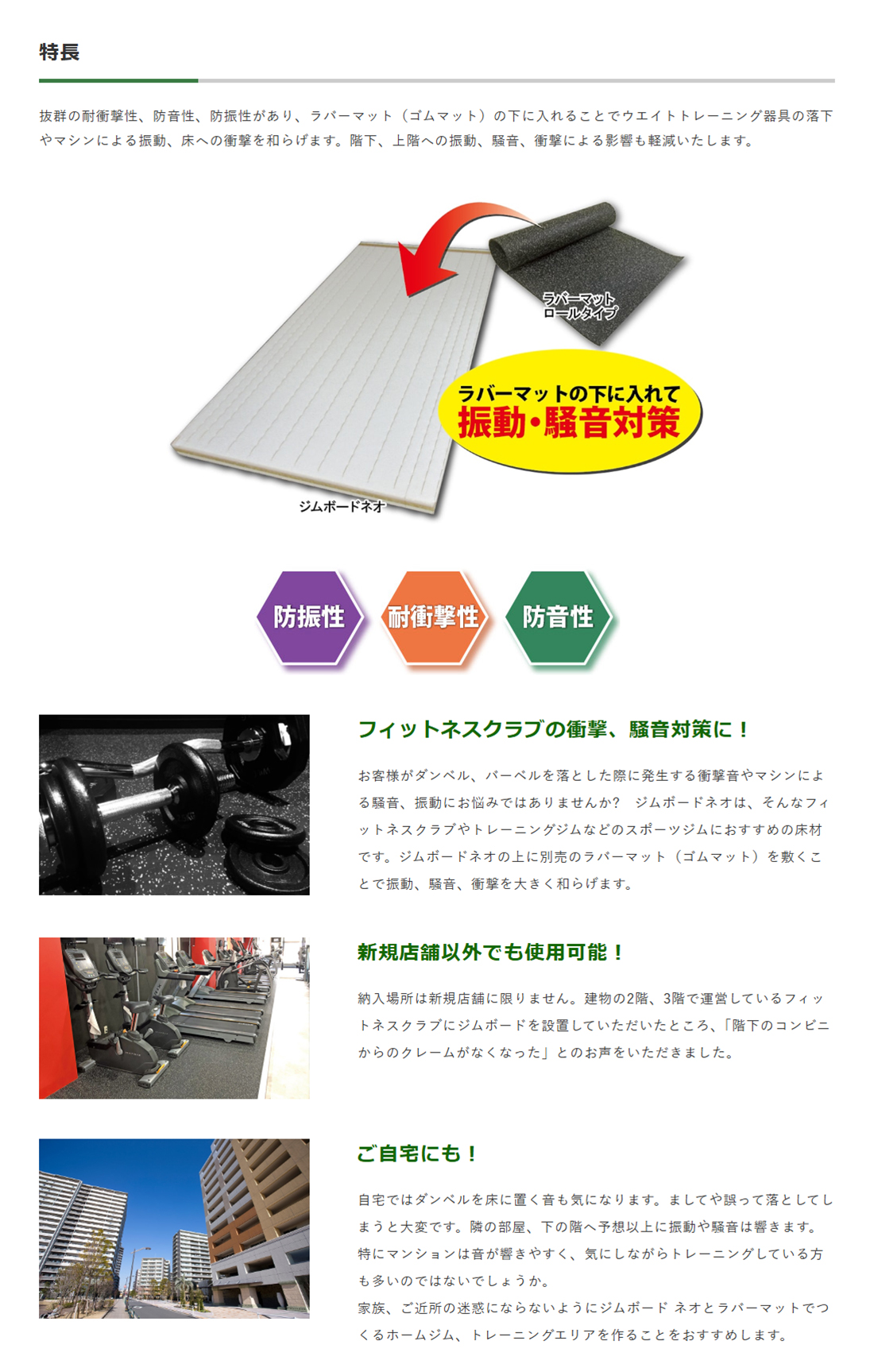 ・抜群の耐衝撃性、防音性、防振性があり、ラバーマット(ゴムマット)の下に入れることでウエイトトレーニング器具の落下やマシンによる振動、床への衝撃を和らげます。階下、上階への振動、騒音、衝撃による影響も軽減いたします。
